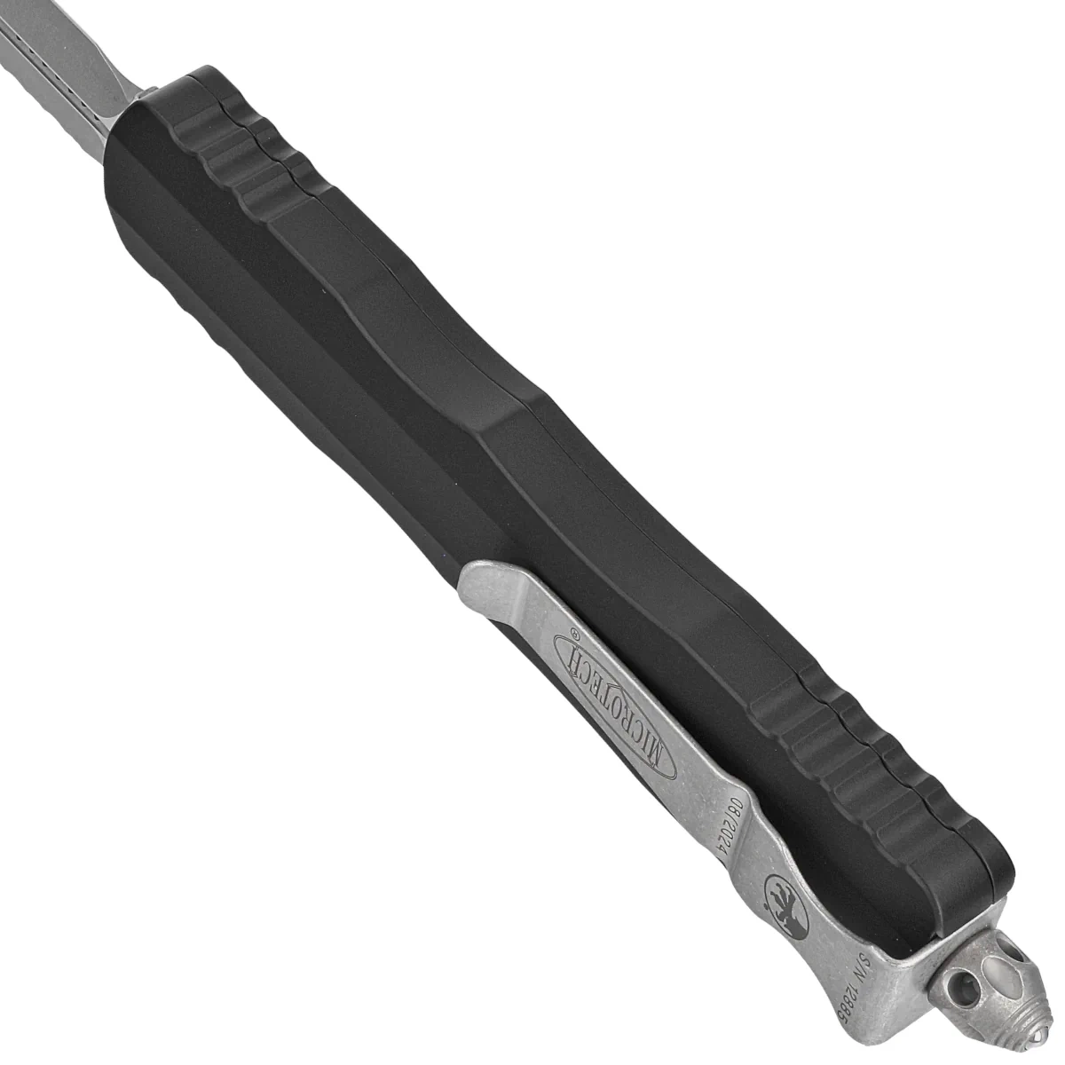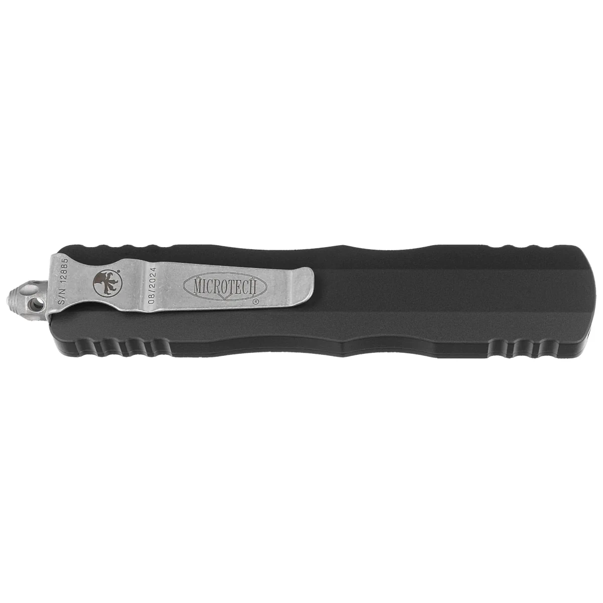 Handle - made with excellent precision in 3D technology on CNC milling machines, from black anodized 6061-T6 aluminum. The surface texture of the Handle makes the knife non-slip in the hand during use. There are notches (jimping) on the back and bottom of the handle for a more secure grip. Characteristic is the location of the slider, in a recess milled into the side of the handle. Thanks to this, the hand lays more naturally when opening and closing the knife. The slim profile and the milled two-position (right/left) solid deep-carry clip allow the knife to be carried discreetly in the pocket, in tip-down position. The clip bears the Microtech logo, serial number and production date. The Handle is finished with glass breaker, a solid steel triangle, into which a tungsten carbide ball has been pressed.