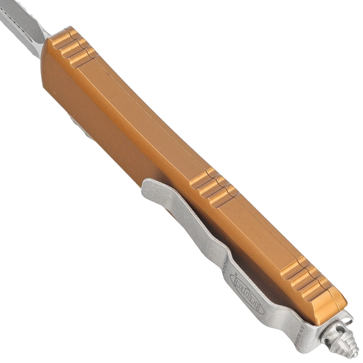 Ultratech D/E Tan Aluminum, Apocalyptic P/S is a full-size OTF (Out The Front) automatic knife from the Ultratech series. Equipped with a hell of a fast mechanism that extends a razor-sharp blade in a striking Apocalyptic patina. 100% made and assembled in the USA. Designed by Anthony Marfione, knifemaker and owner of Microtech Knives.