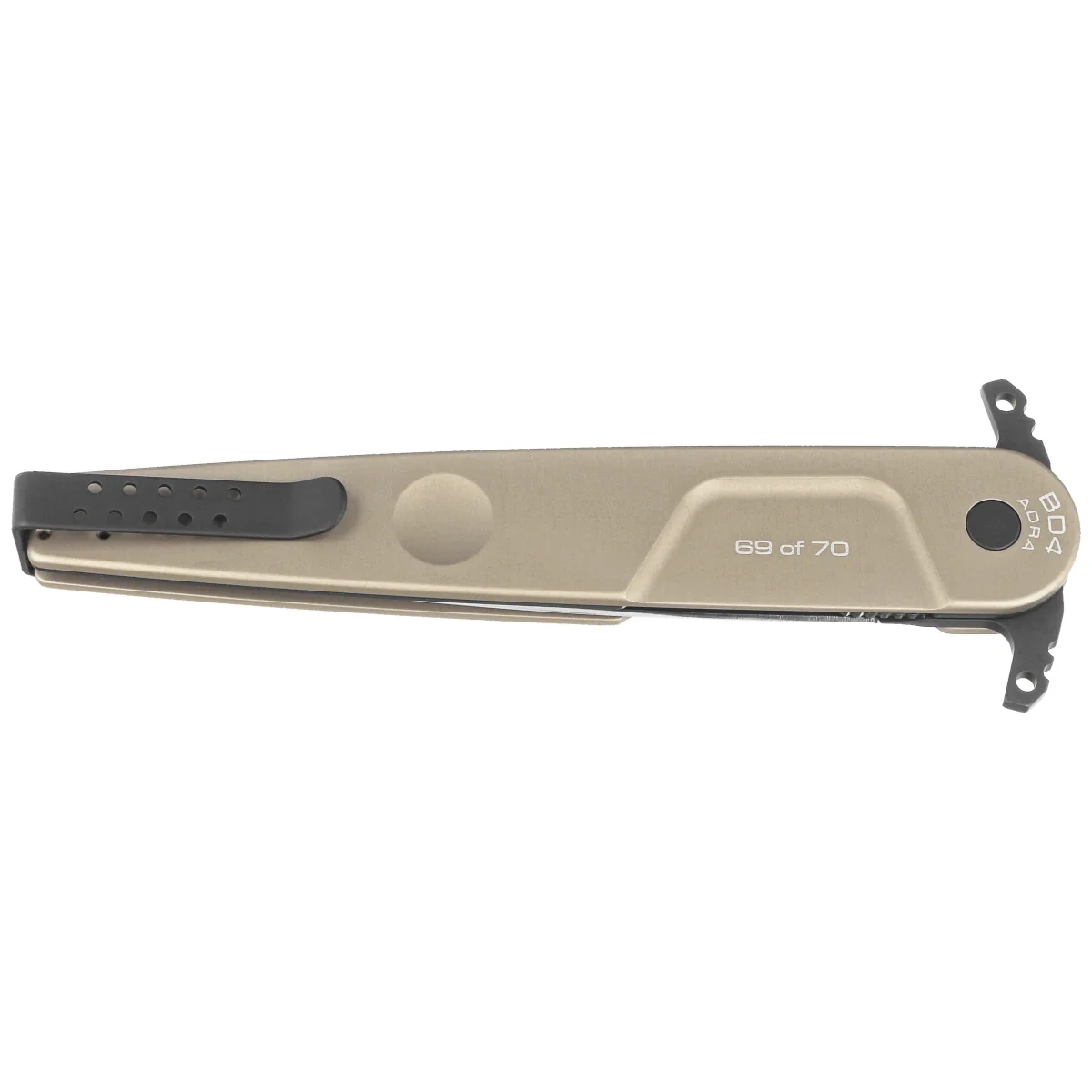 BD4 Adra Contractor LE No 69/70 Tactical Mud Aluminum, Black Limited Edition. Limited to 70 pieces, a limited edition of a large folding tactical knife issued to celebrate the 20th anniversary of the Italian Air Force's special unit, the 17 Stormo Incursori. The knife, numbered 69, its name refers to and pays tribute to the heroic Arditi Distruttori unit of the Regia Aeronautica (ADRA), operating in North Africa during World War II, which won two silver medals for valor on the battlefield.