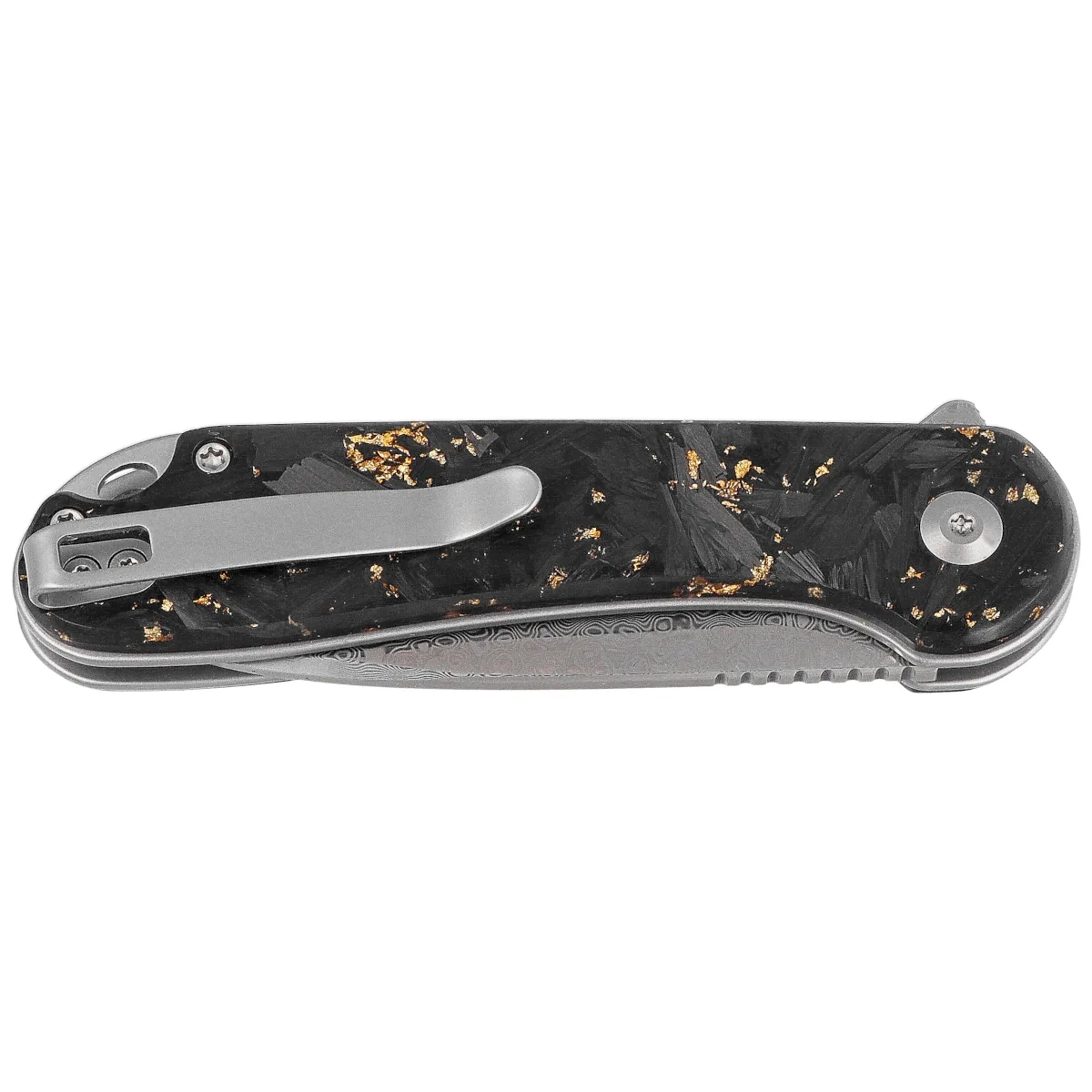 Handle – features unique 3D-patterned scales crafted from shredded carbon fiber and gold shred embedded in transparent resin. All attached to stainless steel liners. Simple, solid construction gives the assurance of many years of use. Open-backed design fixed with steel spacer sleeves reduces weight and facilitates cleaning. The pivot axis is decorated with a stylized Civivi brand logo . Metal one-sided (right) deep-carry clip allows you to carry the knife discreetly in your pocket in tip-up position (blade tip up).