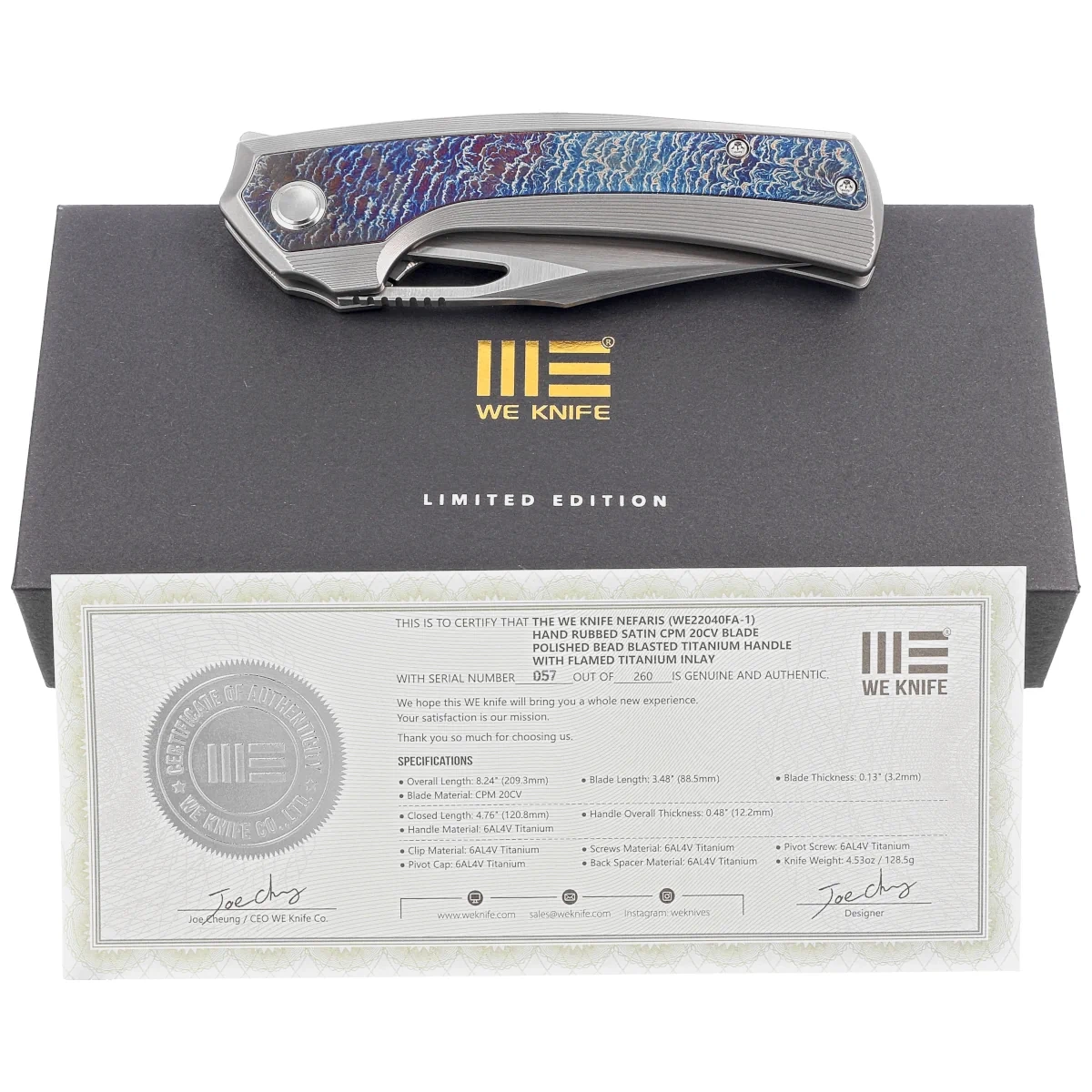 - Nefaris Gray/Flamed Titanium, Hand Rubbed Satin LE. Limited edition WE Knife limited to 260 pcs knife numbered 057. Perfectly crafted titanium Handle with flame-dyed titanium inlay, CPM 20CV steel blade.