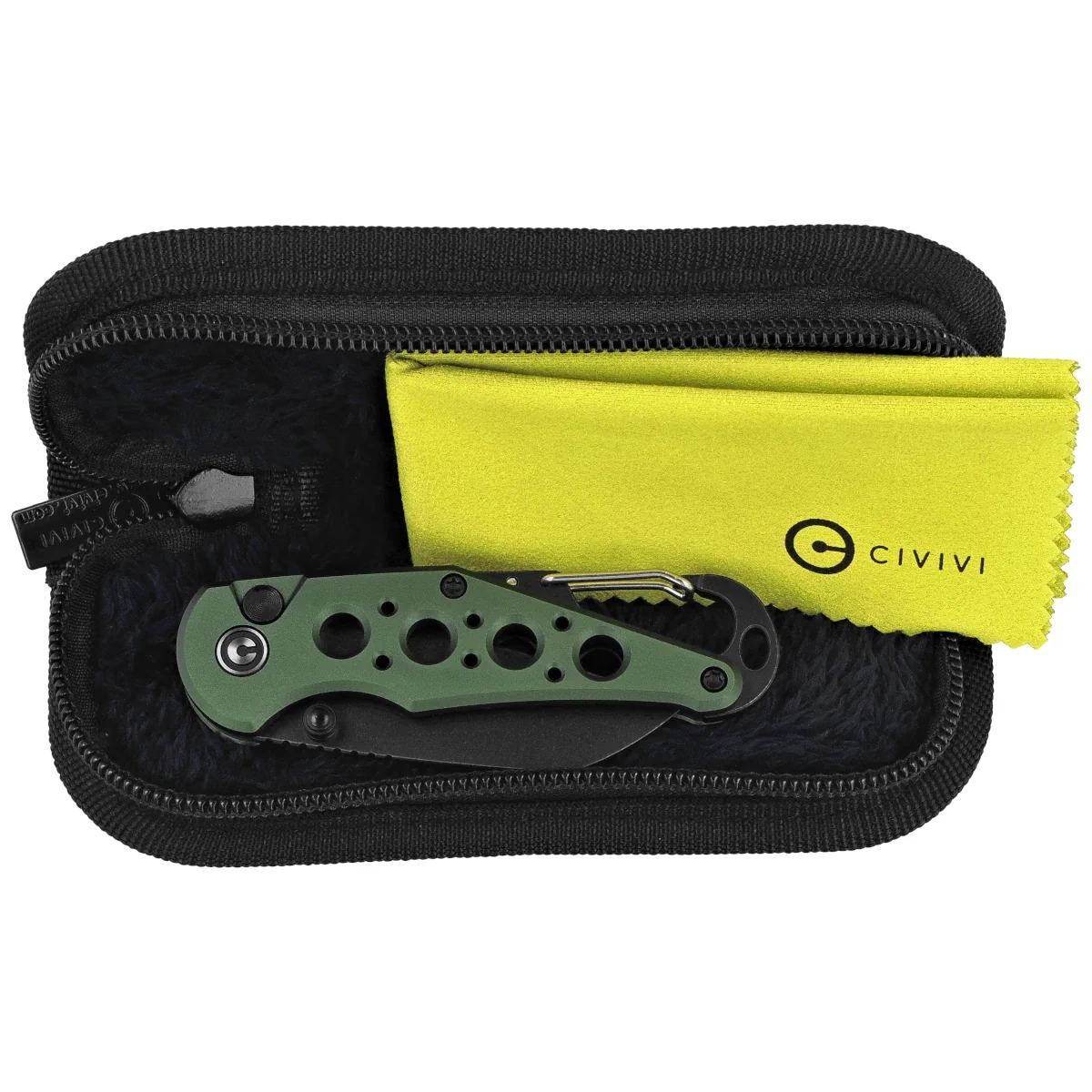 Handle - made of aluminum, whose beveled edges of the covers eliminate sharp edges for comfort, and the fore finger groove made on the front improves grip security. A series of holes in the Handle further relieve pressure on the knife and improve grip. The pivot is decorated with a stylized Civivi brand logo . The Handle is finished with a snap hook, which allows the knife to be clipped to a trouser loop or hooked to the belts of your equipment. It also serves as a bottle opener.