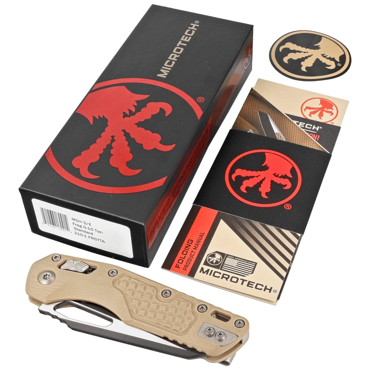 • MSI S/E Tan Frag G10, Black strong folding knife with intuitive RAM-Lok. Superior M390MK blade steel, the result of collaboration between Microtech and Bohler engineers. Ergonomic G10 handle. Designed by Anthony Marfione of Microtech!