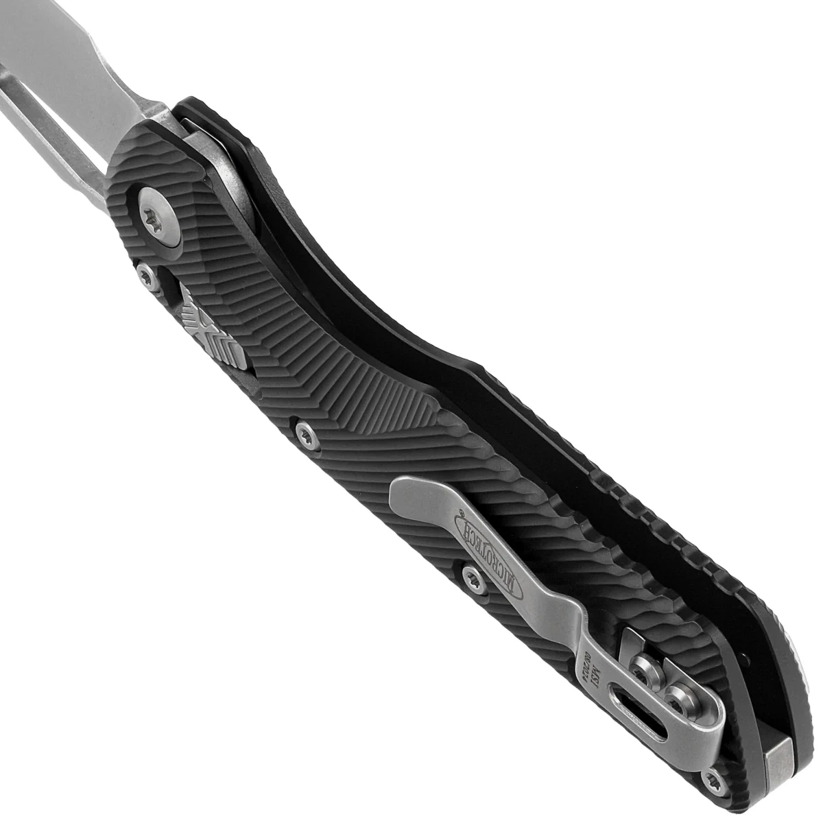 Handle - made with excellent precision in 3D technology on CNC milling machines from anodized aluminum 6061-T6, for better grip covered with milled lines (Fluted). Wide locking slide with Microtech's characteristic stepped X structure . Both grips are bolted together with a solid aluminum backspacer. The double-sided (right / left) clip allows you to discreetly carry the knife in tip-up position. Above the clip a lanyard hole, a place for a safety or decorative cord.