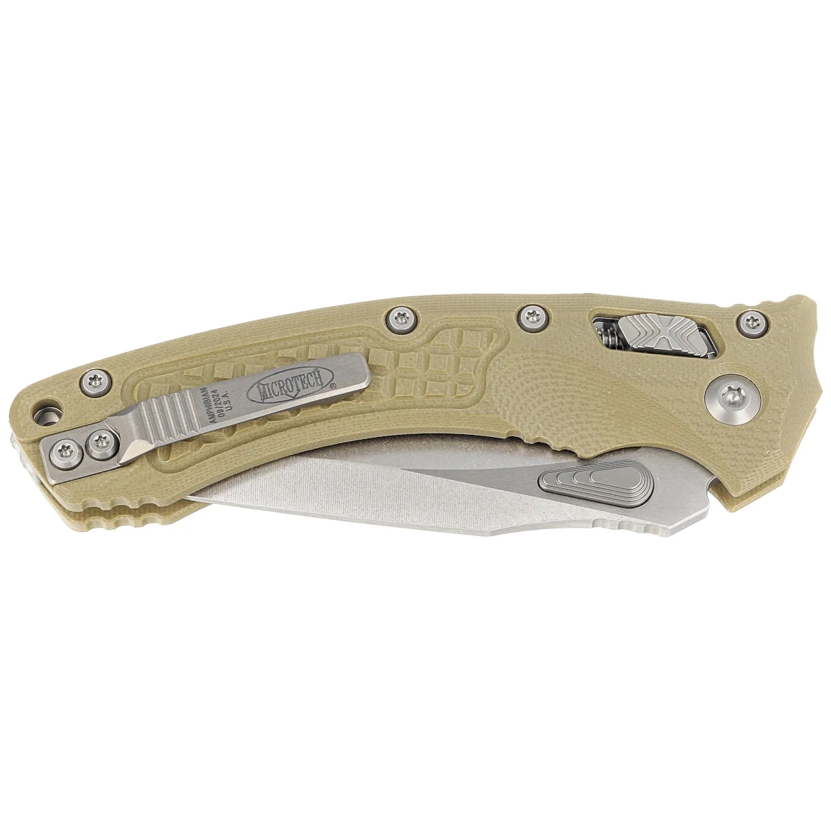 Handle - made of durable G10 composite. The distinctive texture of the Handle imitating the surface of a fragmentation grenade (Frag Pattern) in addition to visual appeal makes the knife does not slip in the hand during use. Wide locking slide with Microtech's characteristic stepped X structure . Both grips are bolstered with a solid backspacer. A double-sided (right / left) titanium clip allows you to discreetly carry the knife in tip-up position. Above the clip a lanyard hole, a place for a safety or decorative cord.