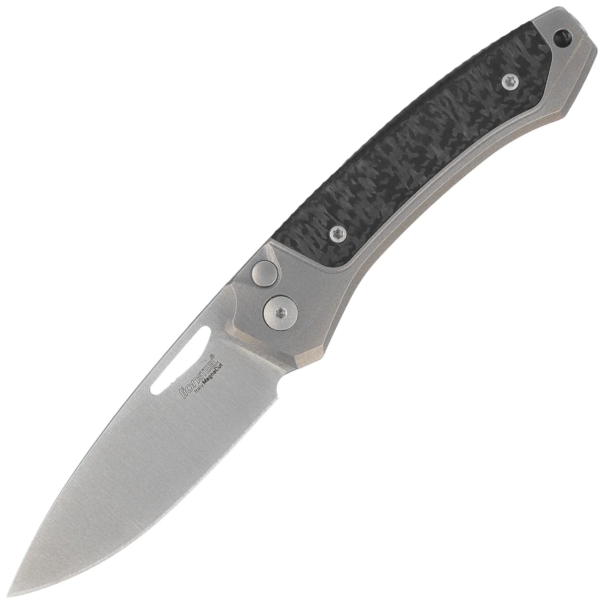 Blade - Drop Point finished with an elegant satin finish. Plain blade is led out with a Flat Grind which gives excellent cutting edge geometry and extreme cutting performance. Ball bearings support the smooth operation of the blade's opening mechanism, which can be opened via a hole in the blade or by gravity. The whole thing is locked with a solid button lock.
