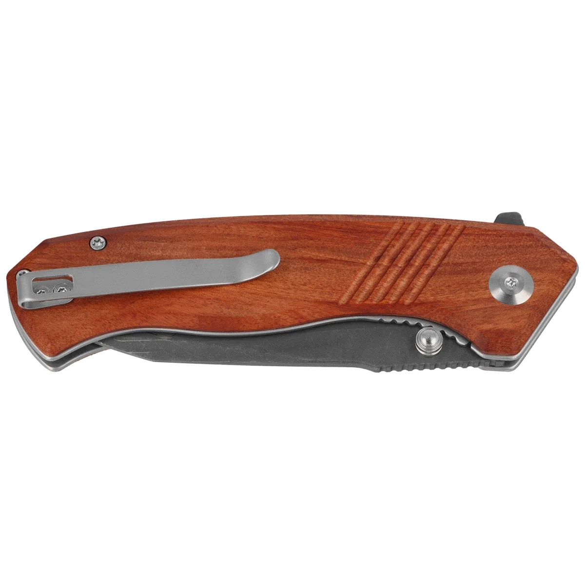 Handle - made of exotic Guibourtia wood with a beautiful grain pattern. Chamfered edges of the cover eliminate sharp edges and rough textured and textured surface increases comfort and sure grip. The open-backed design, fixed with steel spacer sleeves, reduces weight and facilitates cleaning. The pivot axis is decorated with a stylized Civivi brand logo. A two-position, right/left deep carry clip allows you to carry the knife discreetly in your pocket in tip-up position (blade tip up).