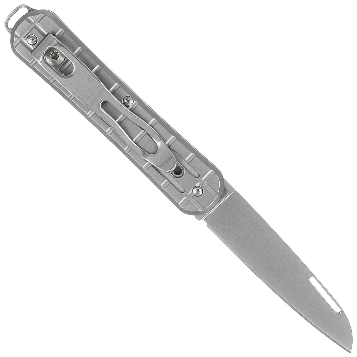 Handle - grips in gray color. Made of titanium, which is resistant to temperature and mechanical damage. The distinctive texture of the Handle imitating the surface of a fragmentation grenade (Frag Pattern) in addition to visual appeal makes the knife does not slip in the hand during use. The simple shape fits perfectly in any hand. The two-position clip allows the knife to be carried in tip-up or tip-down position. In the back, a wide “eye” for threading a belaying or decorative cord.