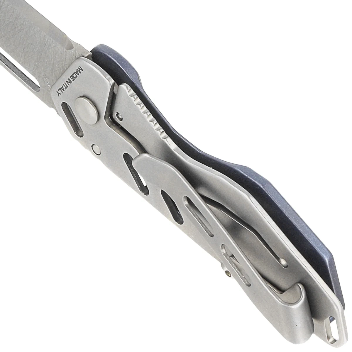 Blade - Wharncliffe type with full flat grind (Full Flat Grind). Raw finish (Sandblast) - its striking appearance was achieved by PTC sandblasting with fine sand. Unlike a steel blade, the PTC blade is completely rustproof, making it suitable for both fresh and salt water. The blade can be opened with a hole in the Blade (thumb hole). Thanks to this, it can be easily used by both right and left-handed people. The whole is locked with the proven Frame Lock.