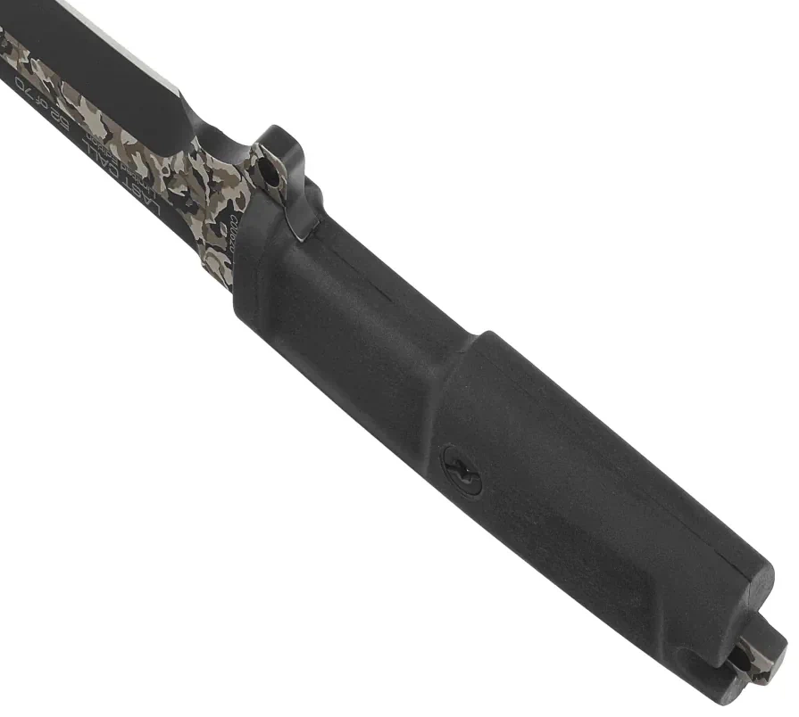Blade - solid with a thickness of 6.3 mm, the blade is chemically polished with a non-reflective MIL-C-13924 BURNISHING coating, the flat part of the blade is covered with a Geotech Camo finish. Plain blade was led out with Flat grind with excellent cutting performance. Finger Choil, an arched undercut for the index finger, makes it easier to control the knife. At the base of the Blade single guard, one-sided steel hilt to protect the hand from slipping during use.