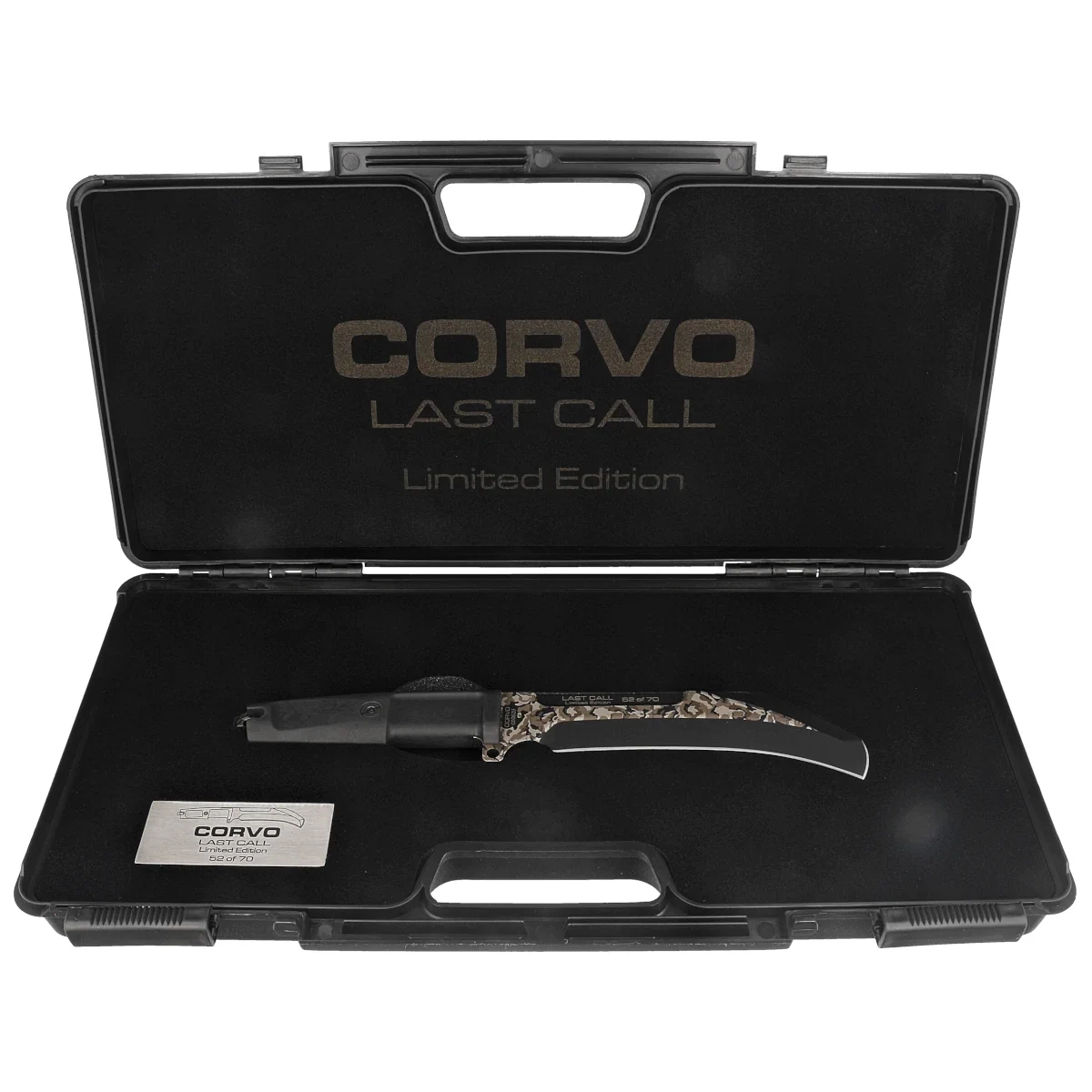 • Corvo Last Call LE No 052/70 Black Forprene, Black MIL-C/Geotech Camo, a limited to 70 pieces version of the knife used by Chilean Special Forces. Comfortable Forprene handle, Böhler N690 stainless steel blade.