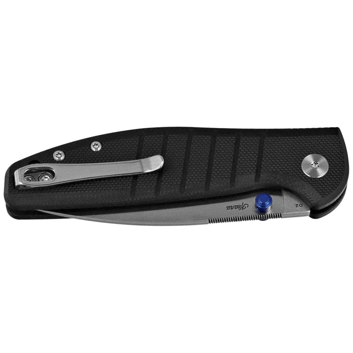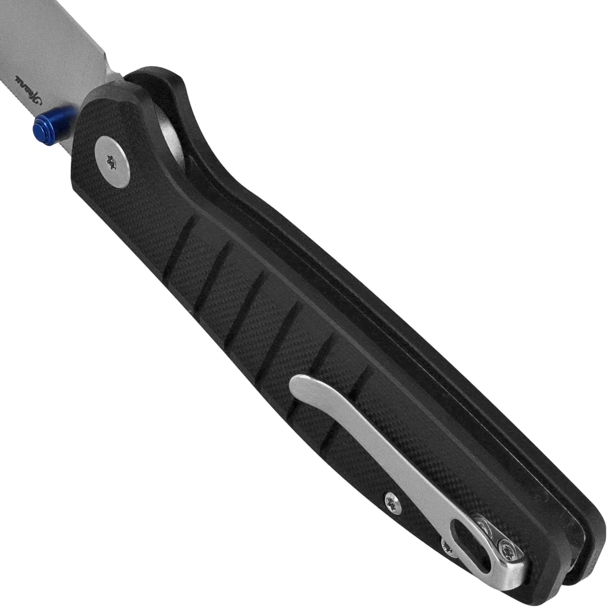 Handle - made of G10, a virtually indestructible plastic insensitive to weather conditions, resistant to chemicals and mechanical damage. Aggressive texture of the grips provides a secure grip, even with wet hands. The cover's chamfered edges eliminate sharp edges for comfort, and the finger undercut made on the front improves ergonomics. The open-backed design fixed with steel spacer sleeves reduces weight and makes cleaning easier. A two-position right/left deep carry clip allows you to carry the knife discreetly in your pocket in tip-up position (blade tip up).