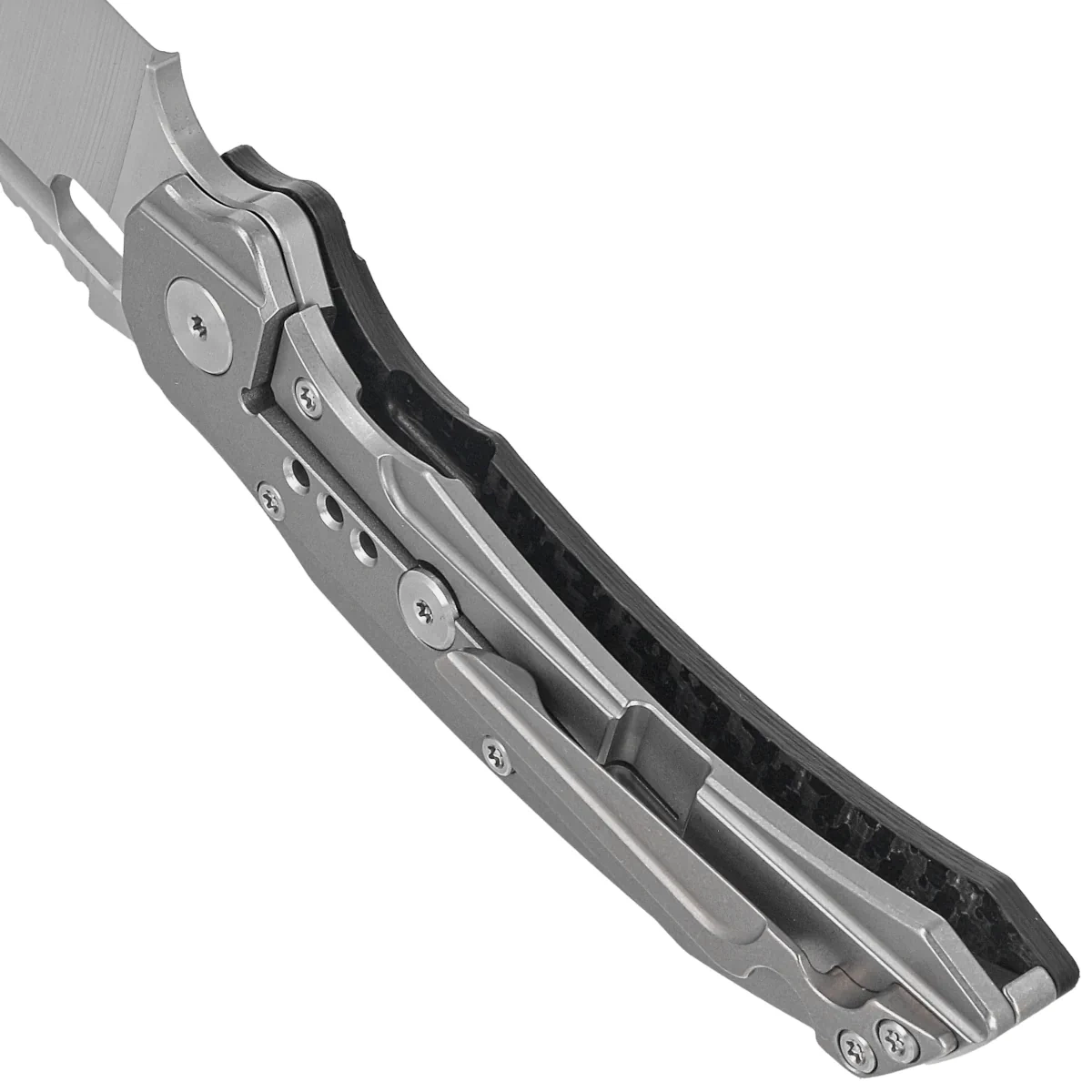 Handle - on the presentation side Carbon Fiber composite, practically indestructible plastic insensitive to weather conditions, resistant to chemicals and mechanical damage. The lock side is solid titanium 6AL4V. Chamfered cover edges eliminate sharp edges for comfort and improve grip security. The solid titanium backspacer to which the grips are attached guarantees the rigidity and strength of the entire structure. The pivot axis decorated with the logo of the designers, Todd Knife and Tool. A single-position, right-handed titanium clip allows the knife to be carried in tip-up position, with the tip of the blade upward.