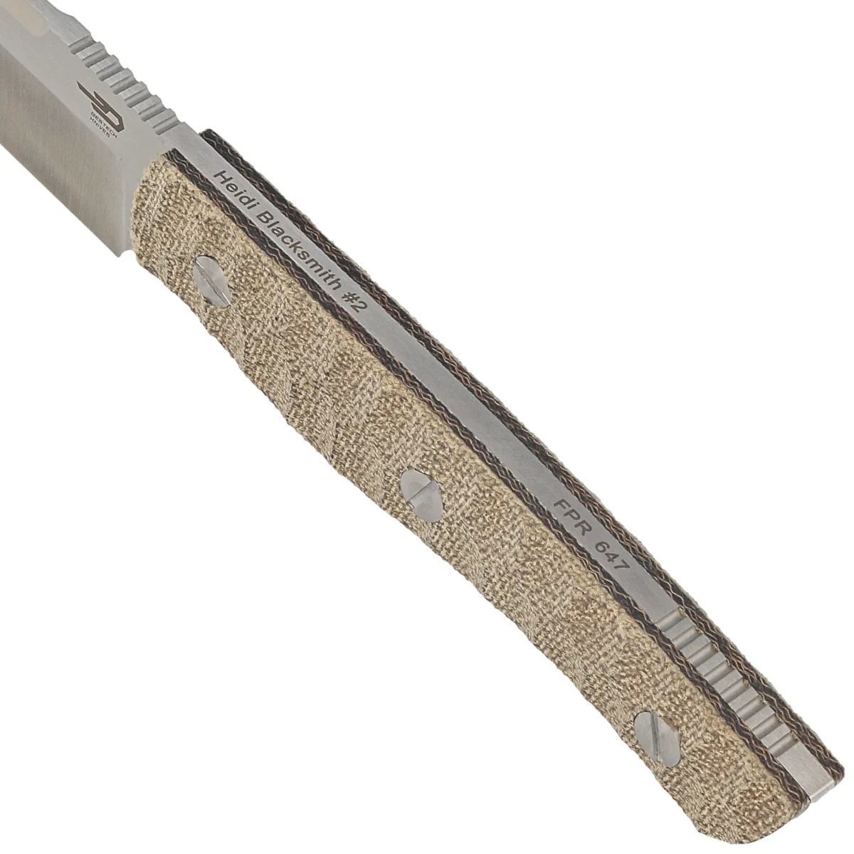 - Heidi Blacksmith 2 Green Canavas Micarta, Satin, fixed blade field knife. Full-tang construction in S35VN stainless steel, mixed grind, kydex sheath for vertical and horizontal attachment. A knife that will not let you down in times of need!