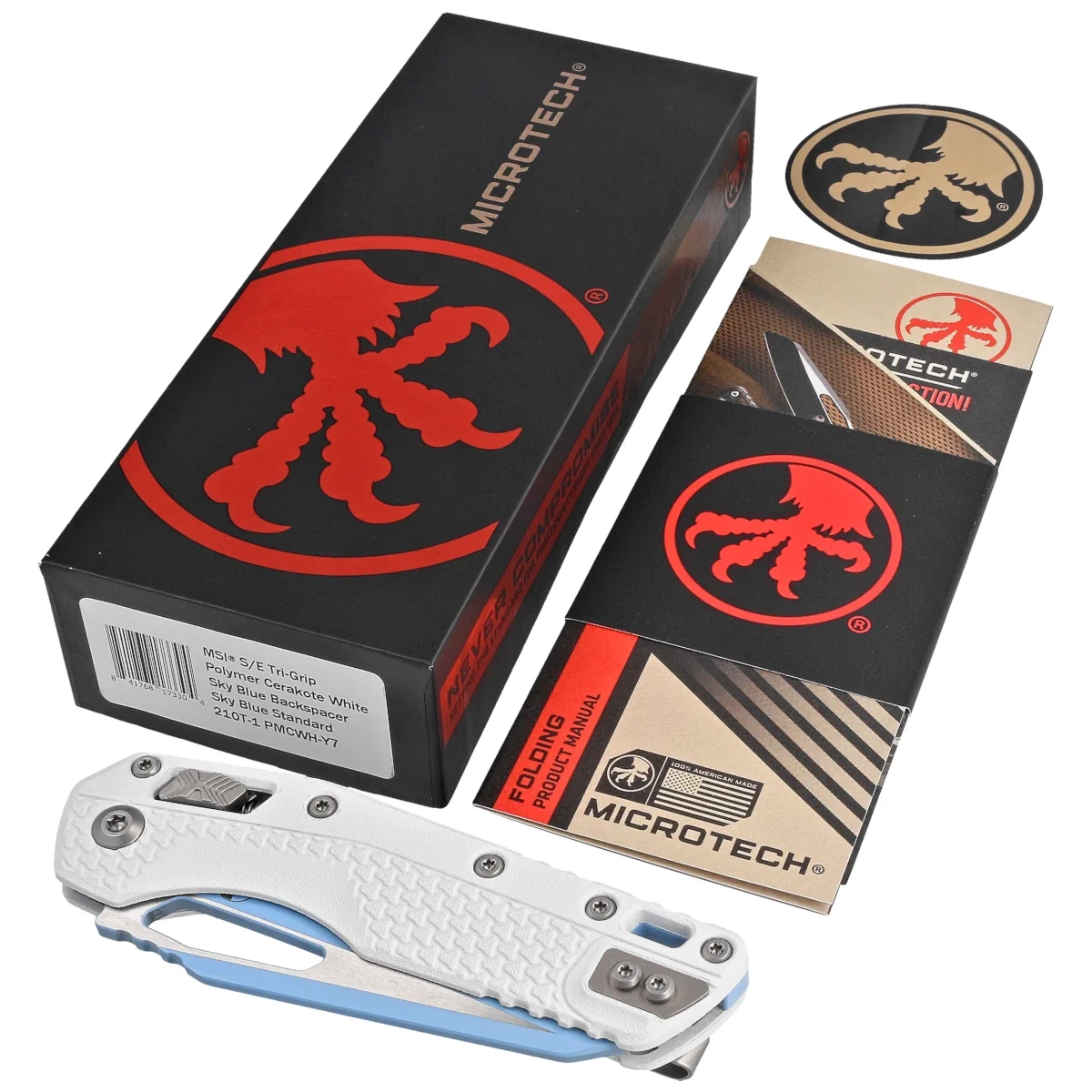 • MSI S/E Ram-Lok White Tri-Grip Polymer, Sky Blue folding knife with intuitive RAM-Lock. Superior M390MK blade steel, the result of collaboration between Microtech and Bohler engineers. Ergonomic polymer handle. Designed by Anthony Marfione of Microtech!