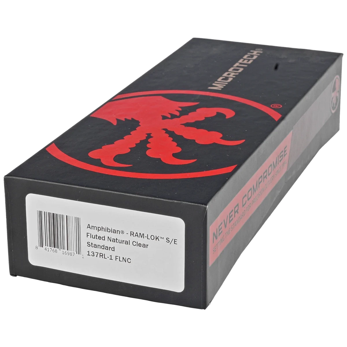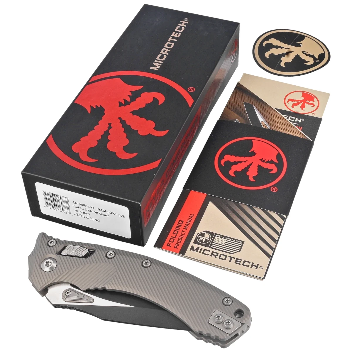 • Amphibian Ram-Lok Fluted Natural Clear Aluminum, Black reissue of folding knife with intuitive RAM-Lock. Superior M390MK blade steel, the result of collaboration between Microtech and Bohler engineers. Ergonomic Handle. Design by Anthony Marfione!