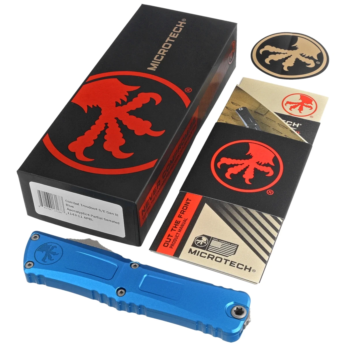 Combat Troodon Gen III S/E Blue Aluminum, Apocalyptic P/S this largest of the automatic knives is the pinnacle of precision engineering and tactical prowess in the field of OTF (Out The Front) knives. Built for a wide range of utility applications, it boasts a 25% larger size compared to the flagship Troodon. Precisely crafted, it features a sophisticated and hellishly fast mechanism that extends the razor-sharp blade. 100% made and assembled in the USA. Designed by Anthony Marfione, knifemaker and owner of Microtech Knives.