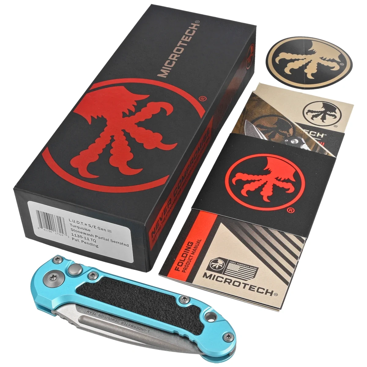 Microtech LUDT Gen III S/E Automatic Knife Turquoise Aluminum, Stonewashed P/S M390MK by Tony Marfione (1135-11TQ)