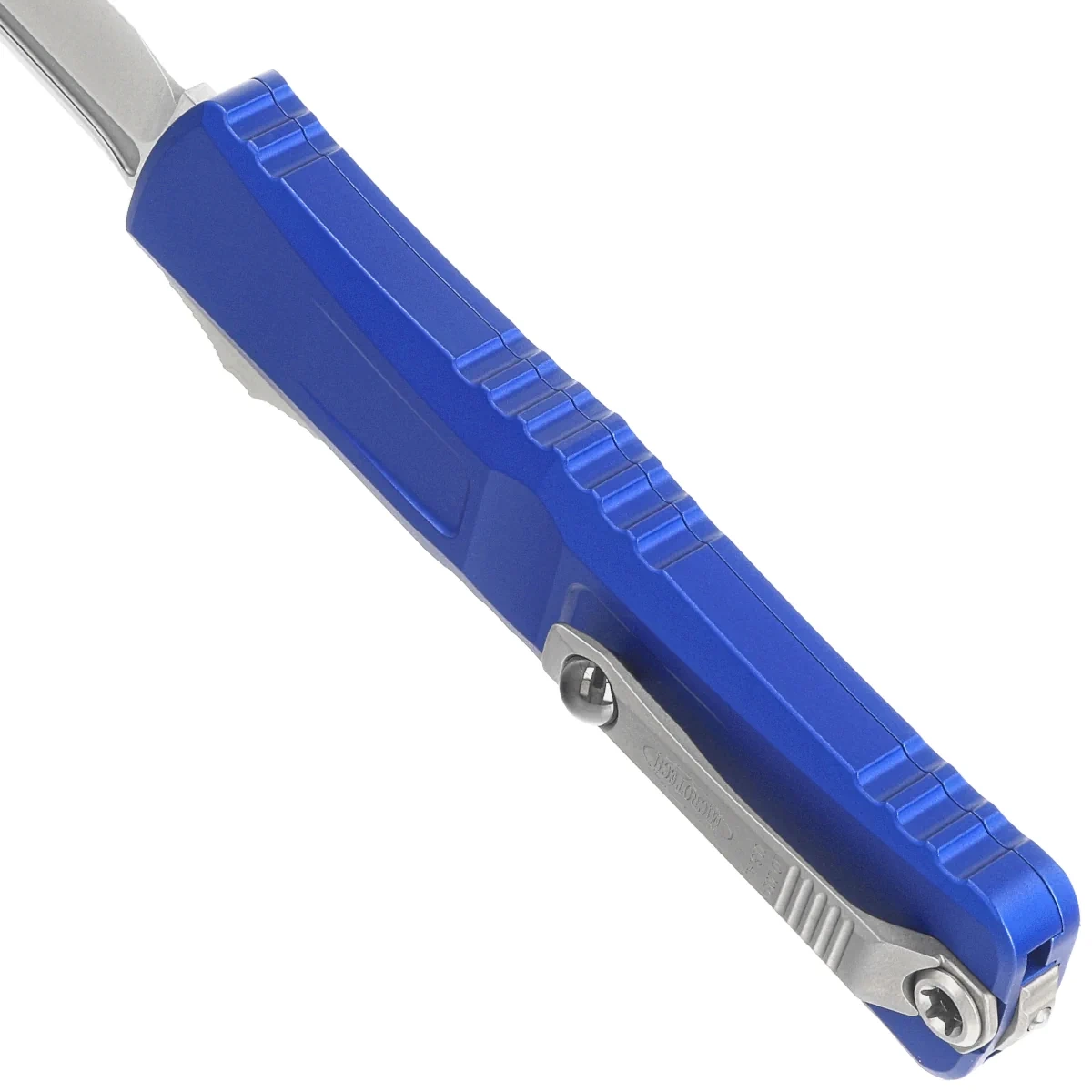 Combat Troodon Gen III T/E Navy Blue Aluminum, Stonewashed this largest of the automatic knives is the pinnacle of precision engineering and tactical prowess in the field of OTF (Out The Front) knives. Built for a wide range of utility applications, it boasts a 25% larger size compared to the flagship Troodon. Precisely crafted, it features a sophisticated and hellishly fast mechanism that extends the razor-sharp blade. 100% made and assembled in the USA. Designed by Anthony Marfione, knifemaker and owner of Microtech Knives.