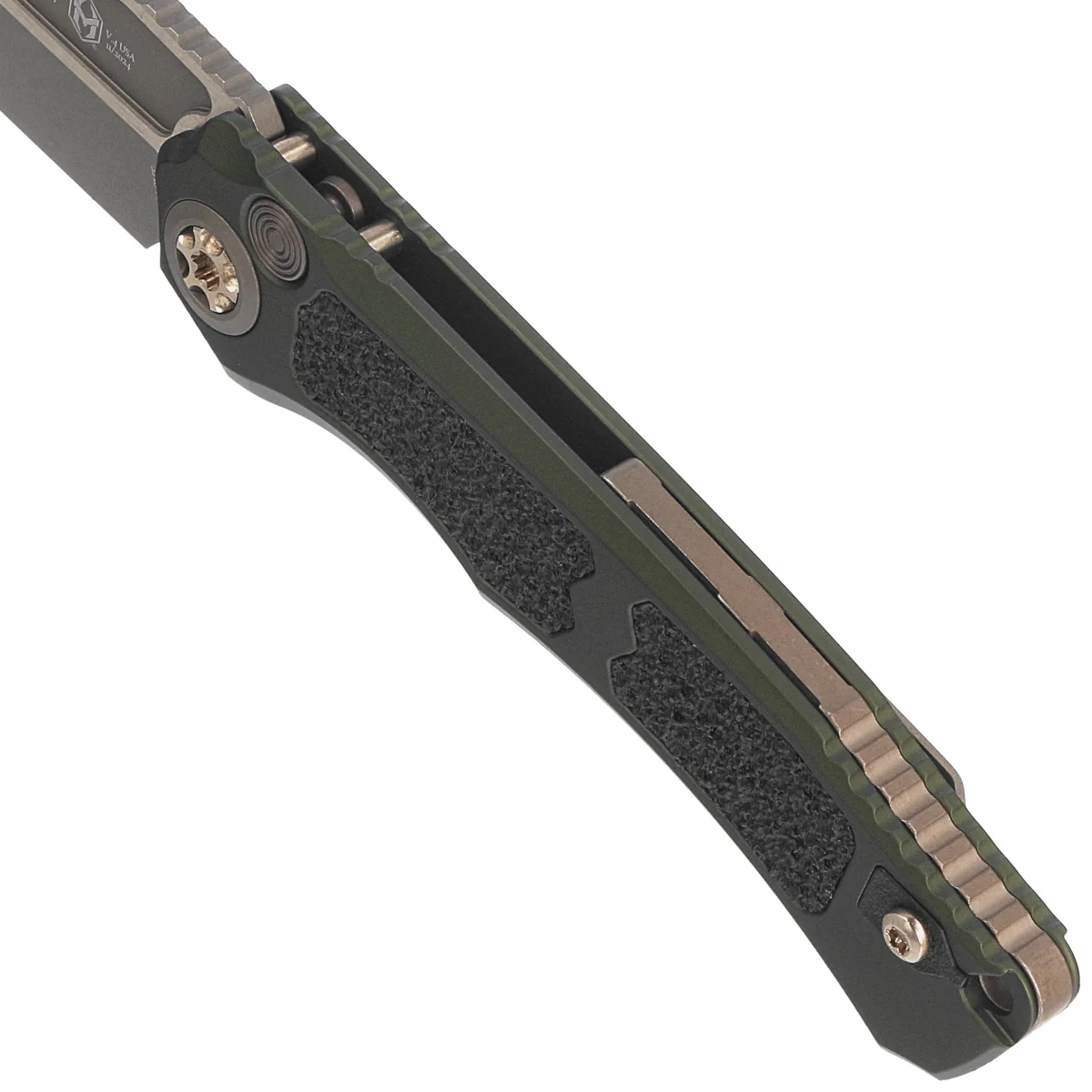 The Wraith Auto V4 Bowie Green Aluminum/3M, Bronze Stonewashed is a powerful switchblade automatic knife from the Wraith-A series, utilizing a spring-loaded blade-opening mechanism that works with tremendous force and power to set it apart from other knives. Equipped with a MagnaCut steel blade and an aluminum handle featuring black traction inlay, combining enhanced grip with refined elegance. Designed for on-the-job performance, it combines elegance and functionality. The precision craftsmanship quality of the materials makes it not only a practical tool, but also a work of functional art. Whether you are a knife collector or looking for a reliable tool for everyday use, the Wraith Auto is a knife that is sure to exceed your expectations, a unique experience that redefines what an automatic knife can be.