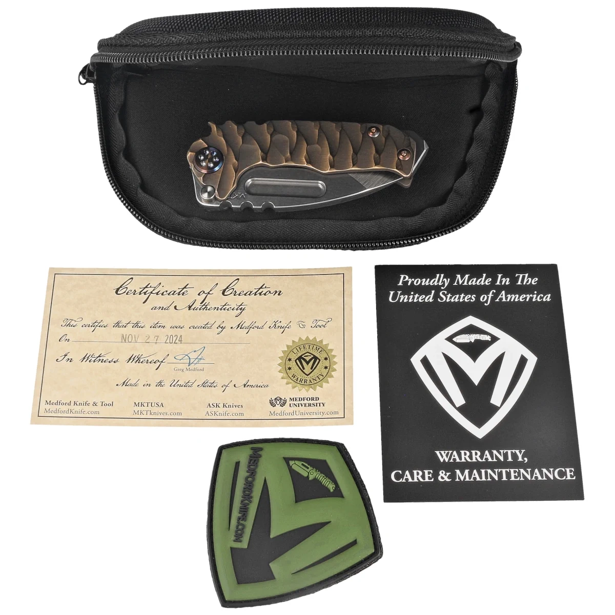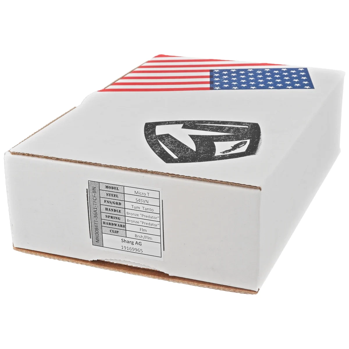 Micro Praetorian T Tanto, Bronze "Predator" Titanium, Flamed HW, Brushed/Flamed Clip, Tumbled smaller version of the famous Medford Praetorian. Rugged and extremely sturdy, massive CPM S45VN steel Blade, powerful Titanium Handle. 100% made in the United States, with American materials, by a company run by veterans. The hollow grind on the blade has been crafted by hand - a rarity in the knife industry, achieved by only a select few manufacturers capable of executing such precision.