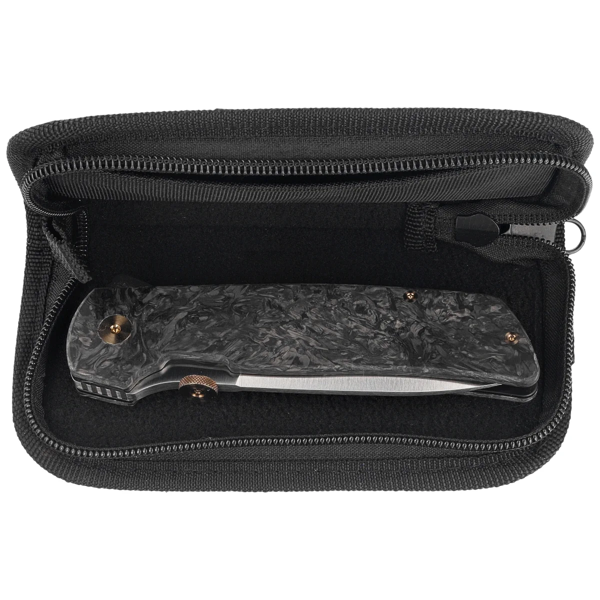 Handle - beveled grips made of Dark Matter Fat Carbon composite, practically indestructible plastic insensitive to weather conditions, resistant to chemicals and mechanical damage, slightly profiled. The massive backspacer to which the grips are attached guarantees the rigidity and strength of the entire structure. The simple, solid design gives the assurance of many years of use. One-position (right) titanium clip allows you to carry the knife discreetly in your pocket in tip-up position (blade tip up).