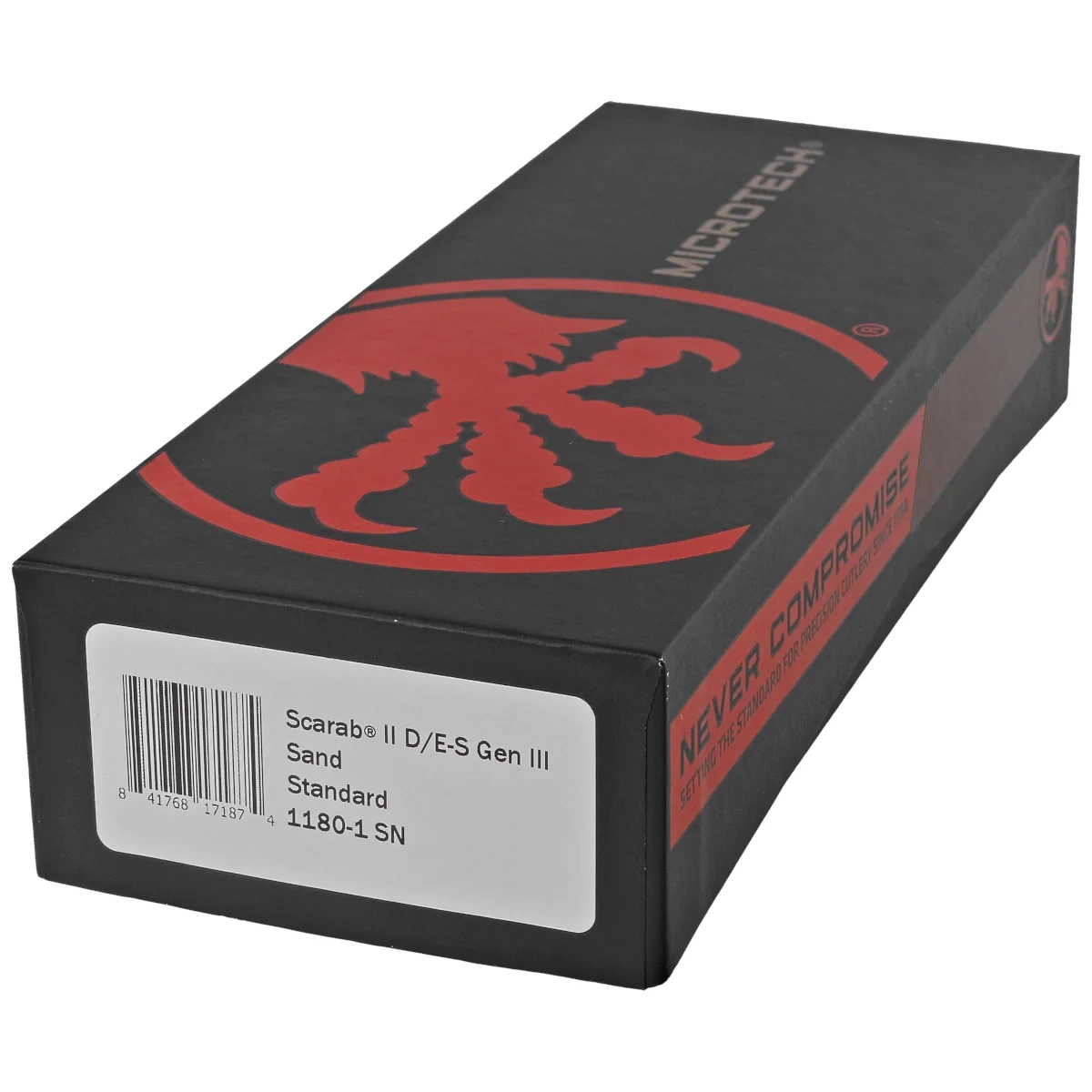 Scarab II Gen III D/E-S Sand Aluminum/3M, Black is the pinnacle of excellence in automatic tactical knives, taking inspiration from the original Microtech Ultratech design. Built to withstand the toughest conditions, the new Scarab II is the ultimate choice for heavy use. While retaining the styling features of its predecessor, it sets a new standard for OTF (Out The Front) technology.