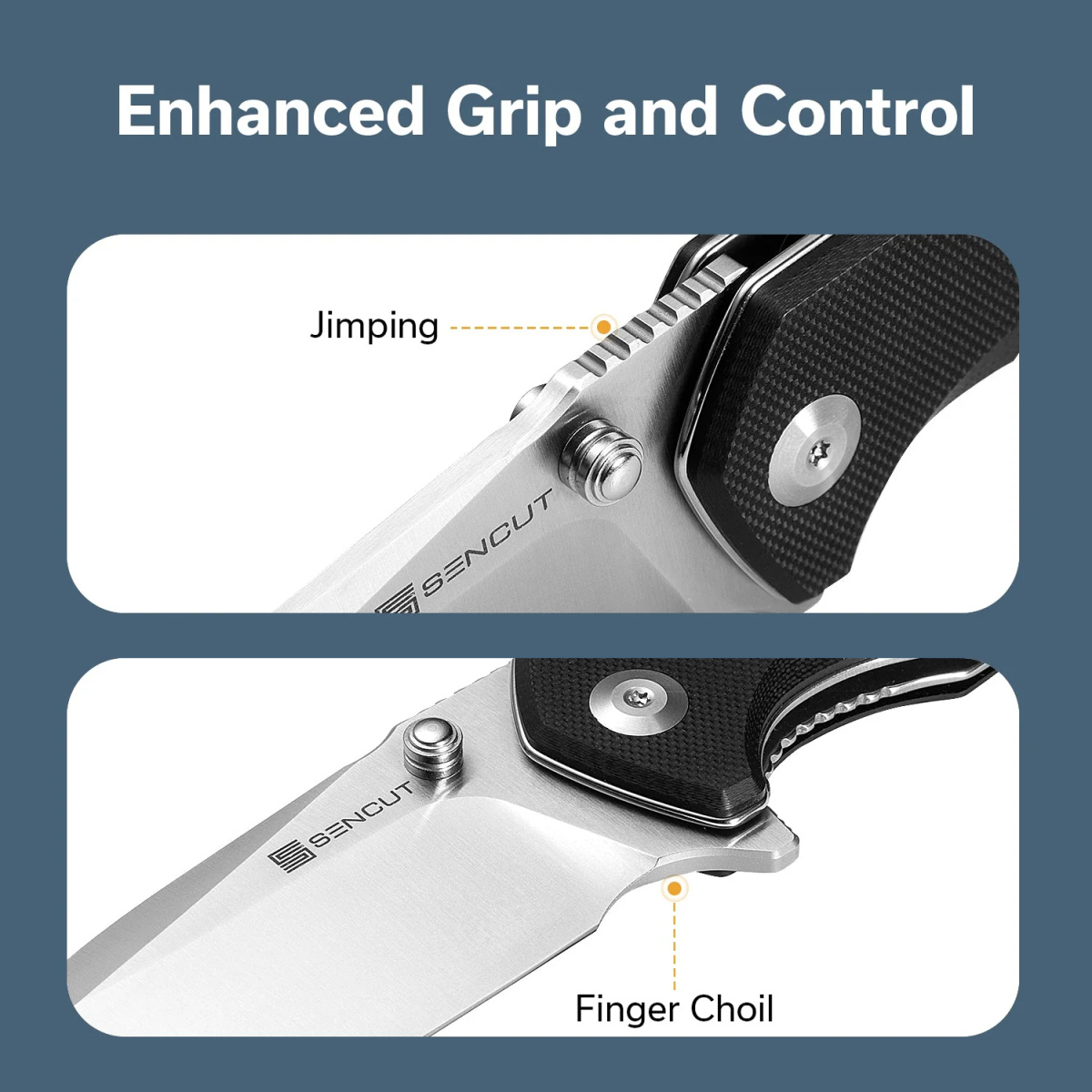 • Skarnax Black G10, Satin large EDC folder designed for daily use. Features a full-size G10 composite handle and a blade made of 9Cr18MoV stainless steel. It can be opened in two ways: using the flipper or the dual thumb studs on the blade.