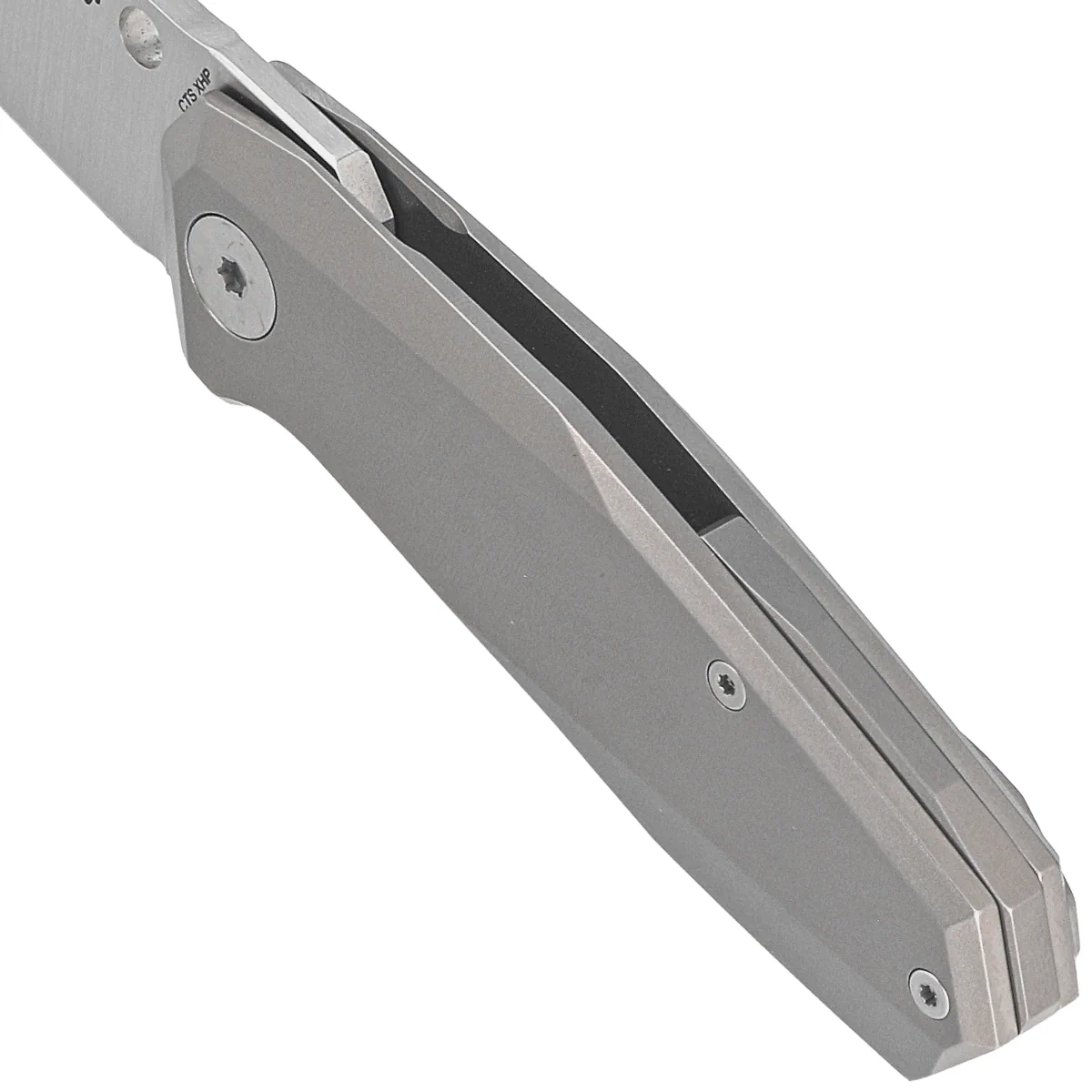 Handle - solid titanium 6AL4V, sandblasted for better grip. Chamfered edges of the covers eliminate sharp edges for comfort and improve grip security. Connected to each other by a solid titanium backspacer for rigidity of the whole structure. The simplicity and sturdiness of the construction provide assurance of many years of use. Single-position clip (right), made of titanium, allows you to carry the knife in tip-up position.