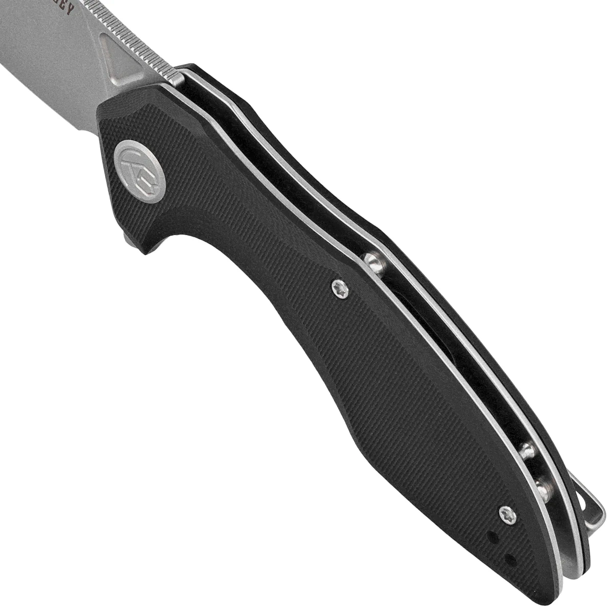 Handle - grips made of G10 composite, a material extremely mechanically durable and practically completely resistant to weather and chemicals, textured for improved grip security, screwed to the steel frame of the knife. The so-called open-backed design attached by steel spacer sleeves reduces weight and facilitates cleaning. The simple, sturdy design gives you the assurance of many years of use. A fore finger groove improves grip security and creates a mini-guard to prevent your hand from slipping on the blade. The pivot axis is decorated with a stylized manufacturer's logo. A two-position (right/left) metal deep-carry clip allows you to carry the knife discreetly in your pocket in tip-up position (blade tip up).