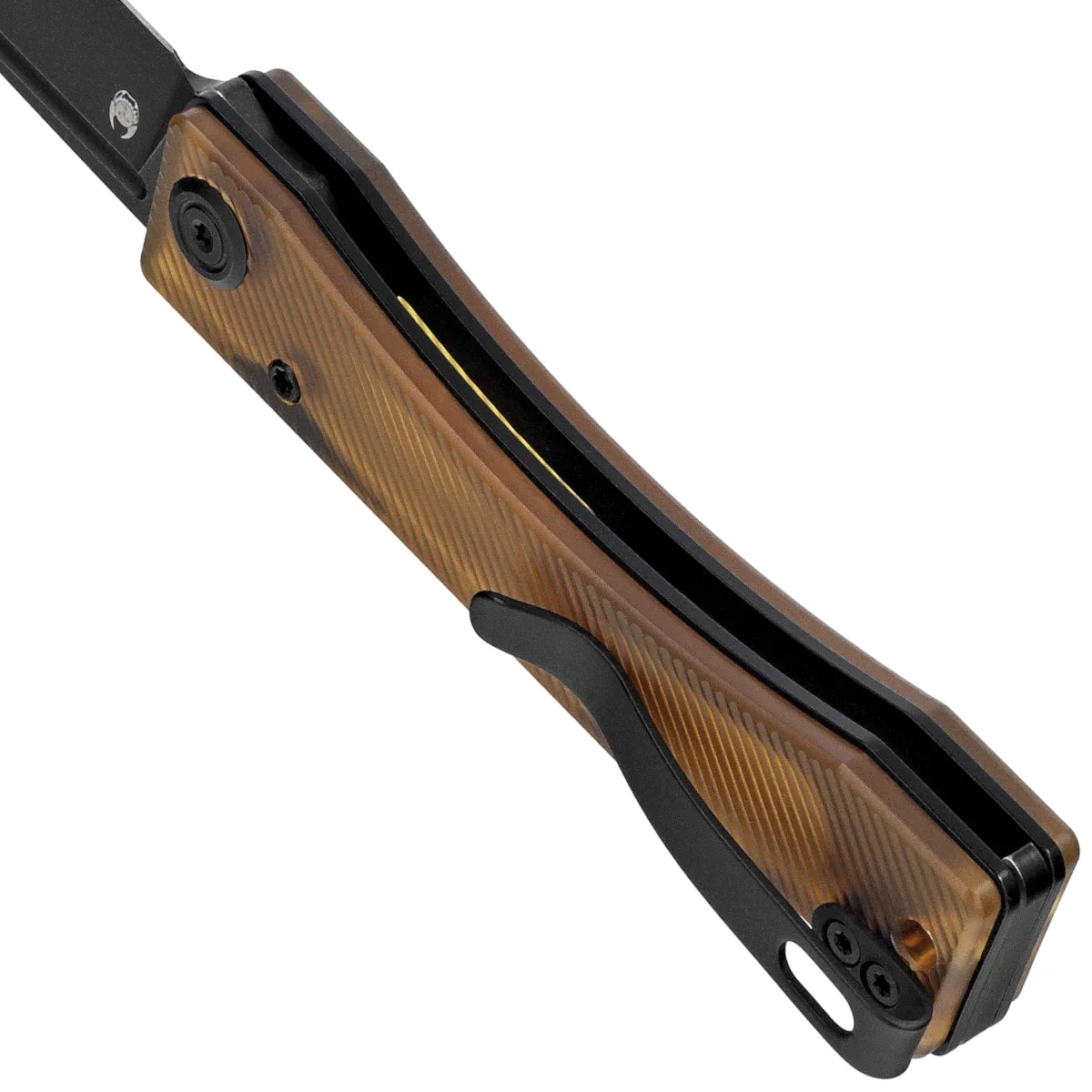 Handle - grips made of Ultem™ composite, a material that is extremely mechanically durable and virtually completely resistant to weather and chemicals, textured for improved grip security, are screwed to the knife's steel frame. The massive backspacer to which the grips are attached guarantees the rigidity and strength of the entire structure. The simple, solid construction gives the assurance of many years of use. The pivot axis is decorated with a stylized manufacturer's logo. A two-position (right/left) metal deep-carry clip allows you to carry the knife discreetly in your pocket in tip-up position (blade tip up). Under the clip a lanyard hole, a hole for threading a safety or decorative cord.