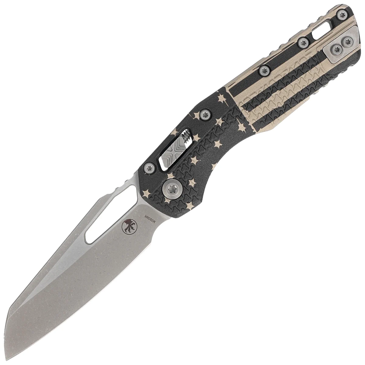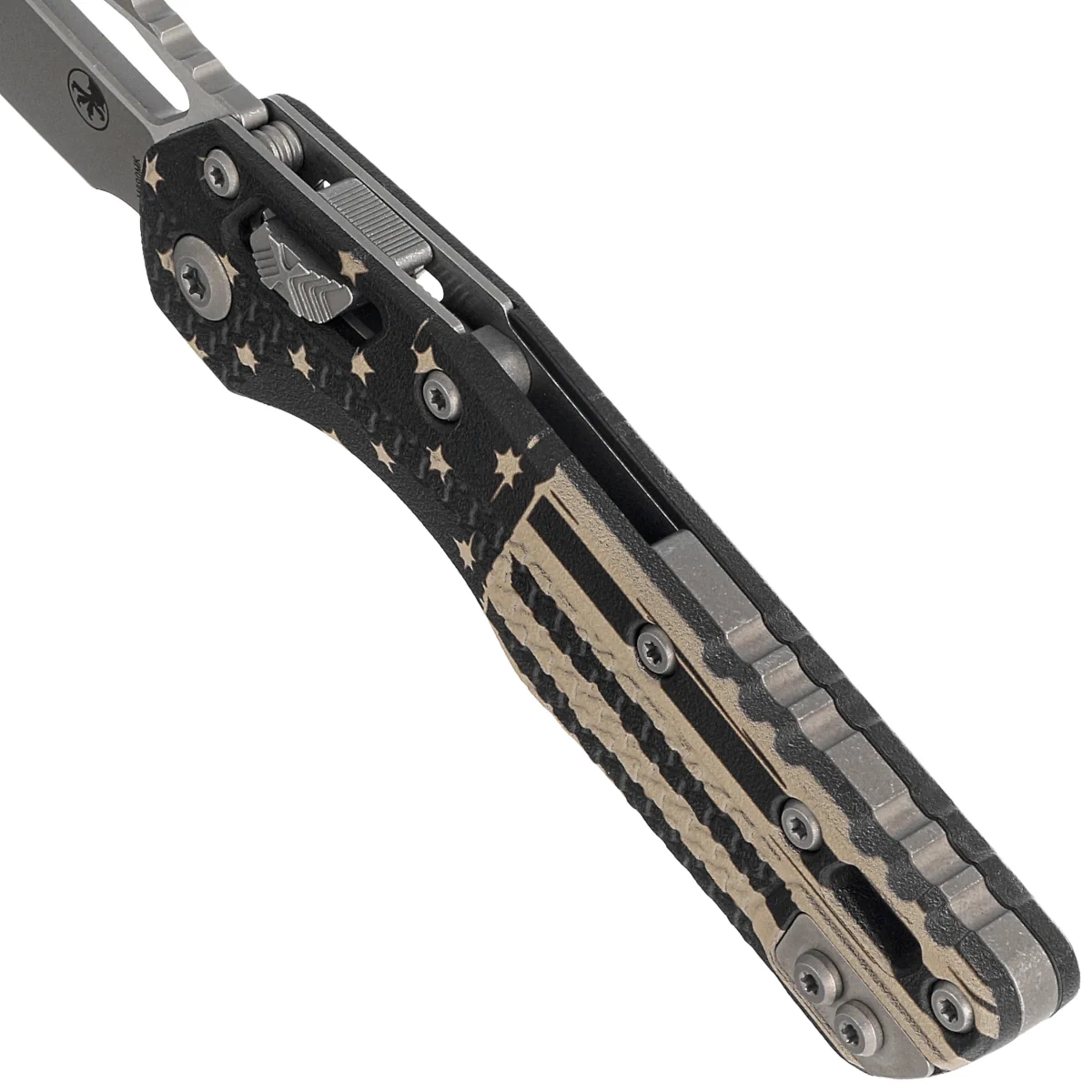 Handle - made of durable polymer, covered with Tri-Grip texture for better grip, decorated with a stylized USA flag. Wide locking slider with Microtech's signature X-pattern texture. Both grips are bolted together with a solid aluminum backspacer. The ambidextrous (right/left) clip allows for discreet tip-up carry. Lanyard hole above the clip for a security or decorative cord.