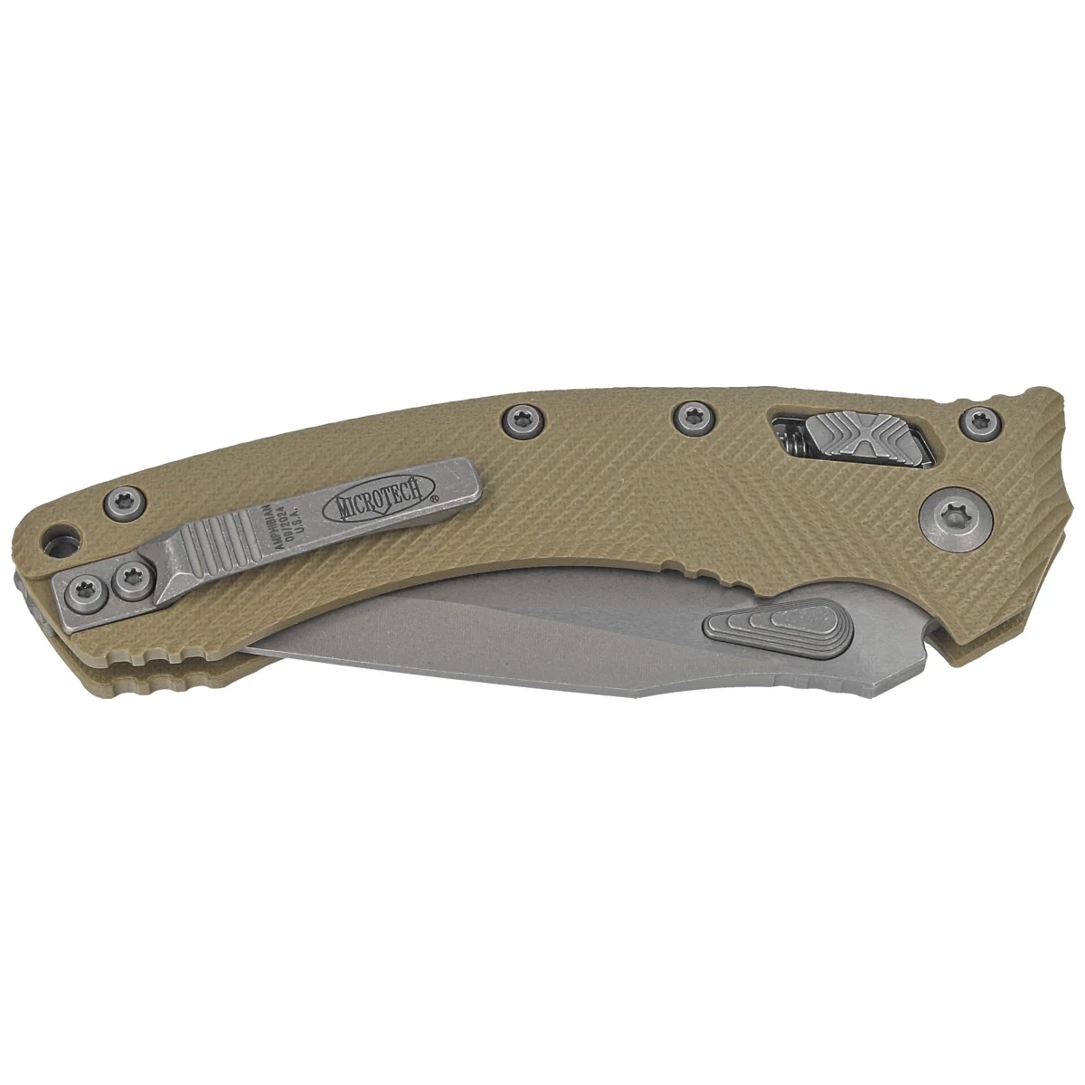 Handle - made of durable G10 composite, covered with milled lines (Fluted) for a better grip. Wide locking slider with Microtech's characteristic X-pattern. Both grips are screwed together with a sturdy backspacer. The reversible (right/left) titanium clip allows the knife to be carried discreetly in the tip-up position. Above the clip is a lanyard hole for a safety or decorative cord.