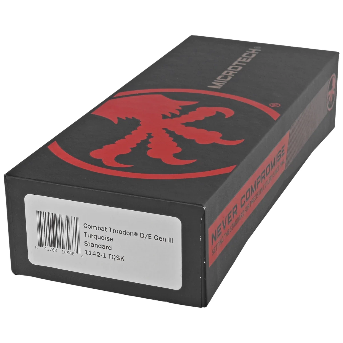 Combat Troodon Gen III D/E Black Aluminum, Turquoise the largest of the automatic knives, is the pinnacle of precision engineering and tactical efficiency in the field of OTF (Out The Front) knives. Built for a wide range of utility applications, it boasts a 25% larger size compared to the flagship Troodon Precision-crafted, equipped with a sophisticated and extremely fast ejector mechanism and a razor-sharp blade. 100% made and assembled in the USA. Designed by Anthony Marfione, knifemaker and owner of Microtech Knives