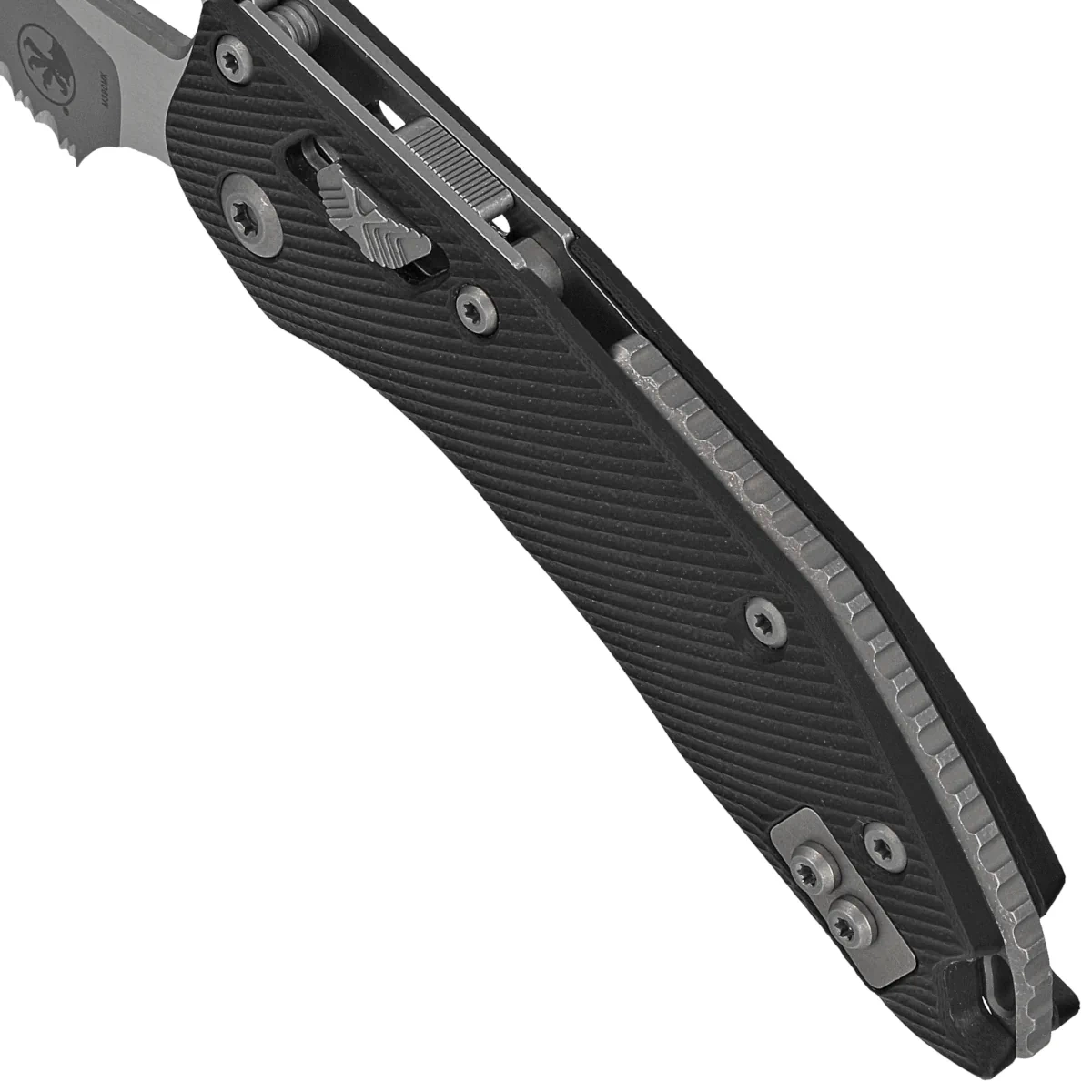Handle - CNC milled with high precision from G10, a virtually indestructible composite material that is resistant to weather, chemicals and mechanical damage, with a deeply milled 3D fluted texture. Wide locking slider with Microtech's signature X-pattern texture. Both grips are screwed together with a solid aluminum backspacer. A two-sided (right/left) clip allows you to carry the knife tip-up. The protruding part of the backspacer, which has a hole for a cord, can also be used as an improvised glass breaker.