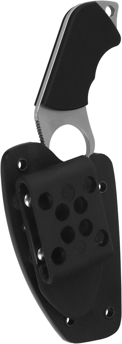 Swick 5 Large Black G10, Satin compact neck knife with a sheath suitable for hanging around the neck, which combines instant self-defense readiness with the convenience of everyday carry. Designed by Spyderco founder Sal Glesser, who drew inspiration from the innovative designs of French knifemaker Fred Perrin. It features a full-sized pistol-style handle and a large 26.1 mm finger hole, specifically designed to fit a man's hand, ensuring maximum control over the tool. Thanks to its thoughtful design, the Swick 5 Large is a reliable tool for both everyday use and situations that require a firm grip and precision cutting.