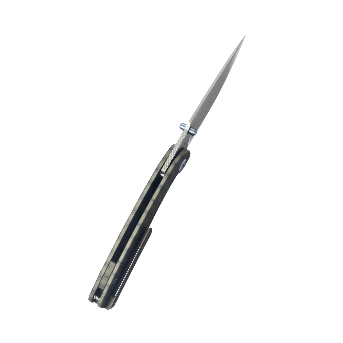 Handle - grips made of titanium 6AL4V with flame-coloring in tiger stripes, a material with high mechanical resistance and almost complete resistance to weather conditions and chemicals, textured with fine milling for better grip. The whole is screwed to a solid backspacer, also made of titanium 6AL4V. The simple, solid construction ensures many years of use. The pivot axis is decorated with a titanium cap (Pivot Cap) in a contrasting color. The single position (right) titanium deep carry clip allows you to carry the knife discreetly in your pocket in a tip-up position (with the tip of the blade up). Space for attaching a safety or decorative cord hidden in the backspacer.