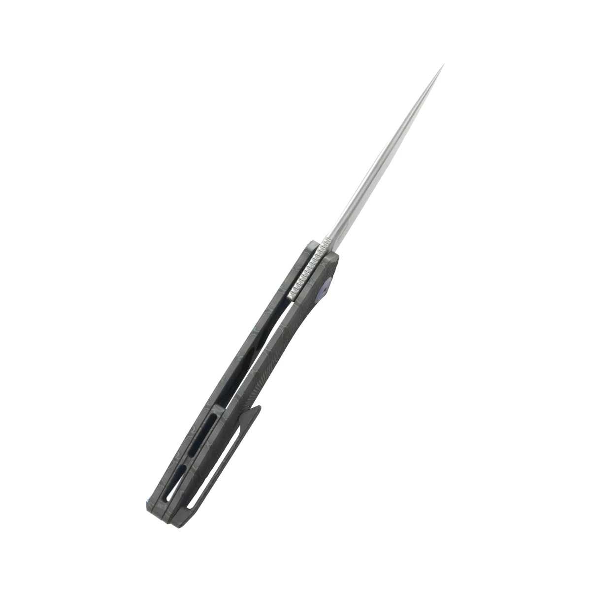 Handle - flame-finished 6AL4V titanium grips with tiger stripes, textured for a better grip. The whole is screwed to a solid backspacer, also made of titanium. The simple, solid construction guarantees many years of use. The deep forefinger groove improves the grip. The titanium deep carry clip (right side, one position) allows you to carry the knife discreetly in your pocket in tip-up position (with the tip of the blade up).