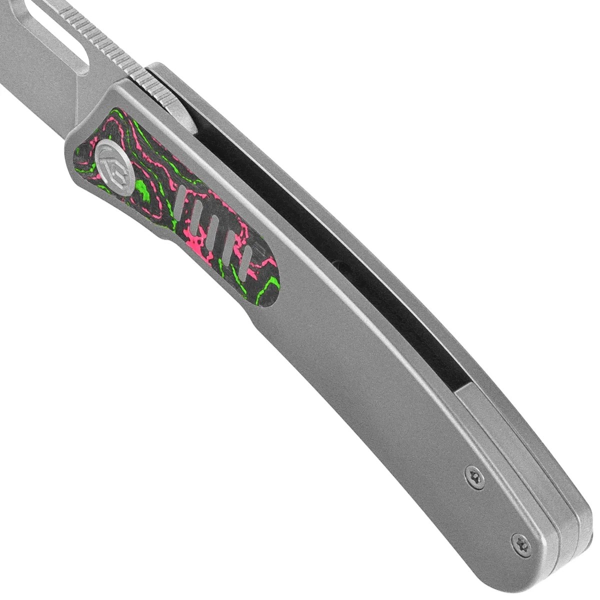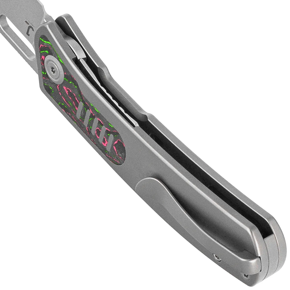 Handle - made of titanium 6AL4V, a material with extremely high mechanical strength and virtually complete resistance to weather conditions and chemicals, with perfectly fitted inlays made of Watermelon Sugar Camocarbon composite. The whole is screwed to a solid backspacer, also made of titanium 6AL4V. The simple, solid construction guarantees many years of use. The single-position (right) titanium deep carry clip allows you to carry the knife discreetly in your pocket in a tip-up position (with the tip of the blade up).