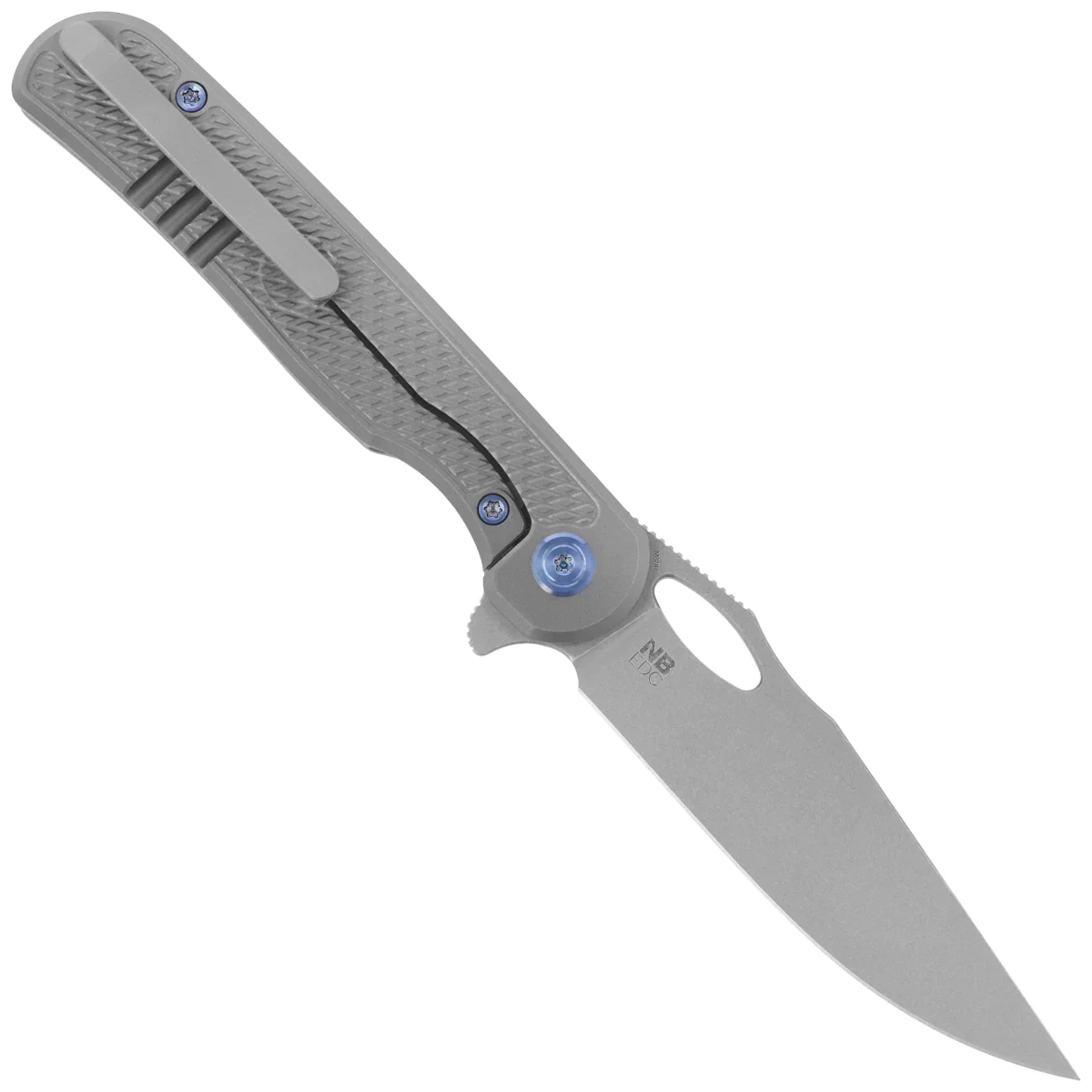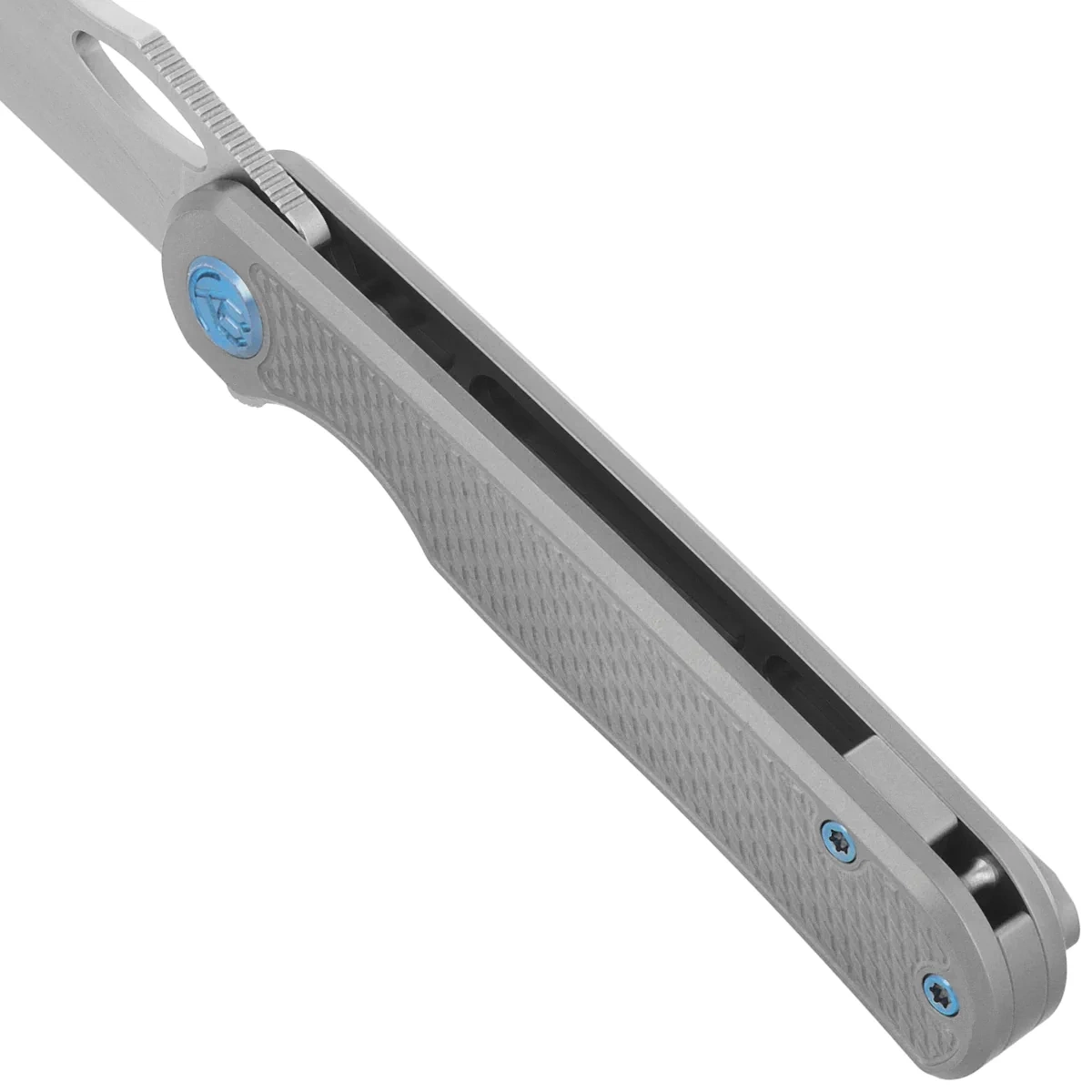 Handle - made of titanium 6AL4V with a characteristic diamond knurling, a material extremely mechanically durable and practically completely resistant to weather conditions and chemicals. The whole is screwed to a solid backspacer, also made of titanium 6AL4V. The simple, solid construction ensures many years of use. The forefinger groove improves grip. The single-position (right) titanium deep carry clip allows you to carry the knife discreetly in your pocket in a tip-up position (with the tip of the blade up).