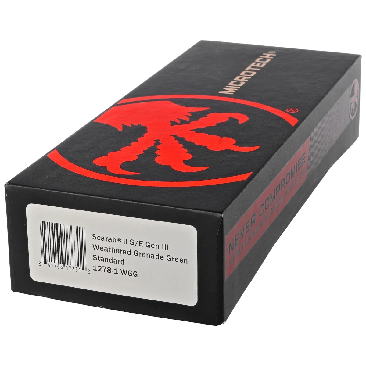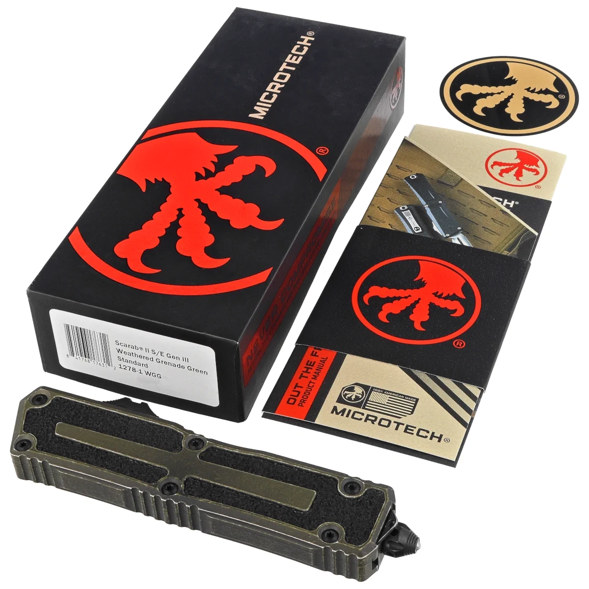 Scarab II Gen III S/E Weathered Grenade Green Aluminum, Weathered Grenade Green is the pinnacle of automatic tactical knives, drawing inspiration from the original Microtech Ultratech design. Built to withstand the toughest conditions, the new Scarab II is the best choice for intensive use. Retaining the design features of its predecessor, it sets a new standard for OTF (Out The Front) technology.
