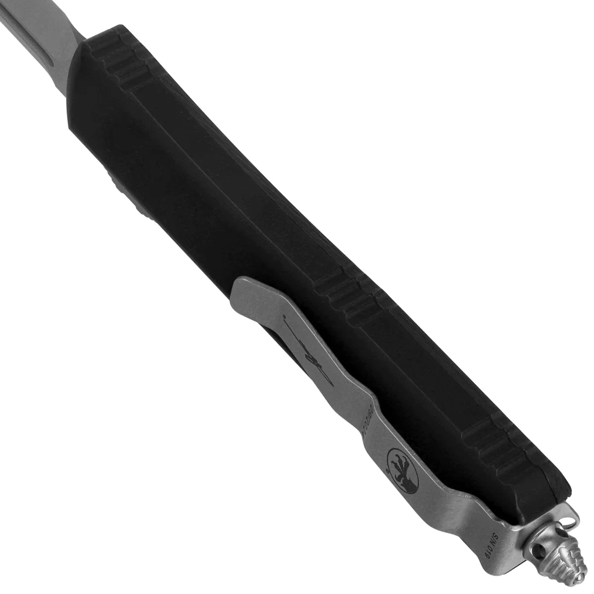 Handle– the display side is made of high-quality Carbon Fiber composite with CNC milling in 3D technology. The other side is made of aluminum 6061-T6. The texture of the handle ensures that the knife does not slip in the hand during use. There are jimping grooves on the top and bottom of the handle for a more secure grip. The slim profile and milled two-position (right/left) solid deep carry clip allow the knife to be carried discreetly in the pocket in a tip-down position. The clip features the Microtech logo, serial number and date of manufacture. The handle ends in a window-pane hammer, a solid steel triangle with a pressed-in tungsten carbide ball. There is also a hole for attaching a decorative cord.