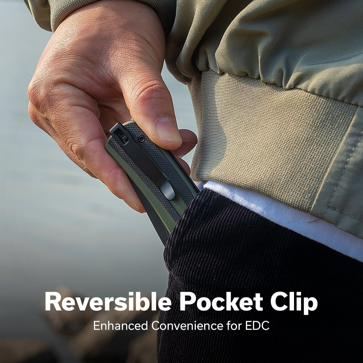 Handle - made of two-tone G10 composite, a virtually indestructible material, insensitive to weather conditions, resistant to chemicals and mechanical damage. The beveled edges of the covers eliminate sharp edges for comfort and grip. The open-backed design, which is attached with steel spacer sleeves, reduces weight and makes cleaning easier. Forefinger groove on the front improves grip. Two-position right/left-handed deep carry clip allows you to carry the knife discreetly in your pocket in a tip-up position (with the tip of the blade facing upwards).