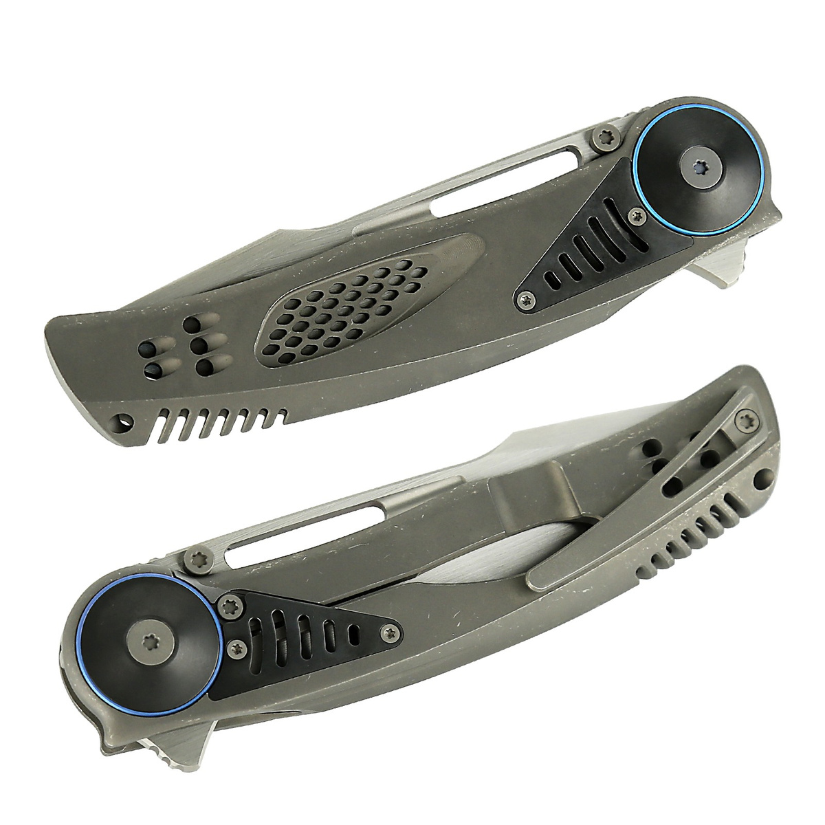 Handle - made of a single piece of titanium 6AI4V, processed on CNC milling machines. Monolithic body with the highest strength, which is a solid structural element guaranteeing rigidity and strength of the entire structure. Only a few companies are able to make a handle with such incredible accuracy! The simple and solid design guarantees many years of use. Single position clip (right) made of titanium allows the knife to be carried in tip-up position. Pivot axis decorated with a blue rim (pivot collar cap) and an elaborately integrated zirconium inlay.