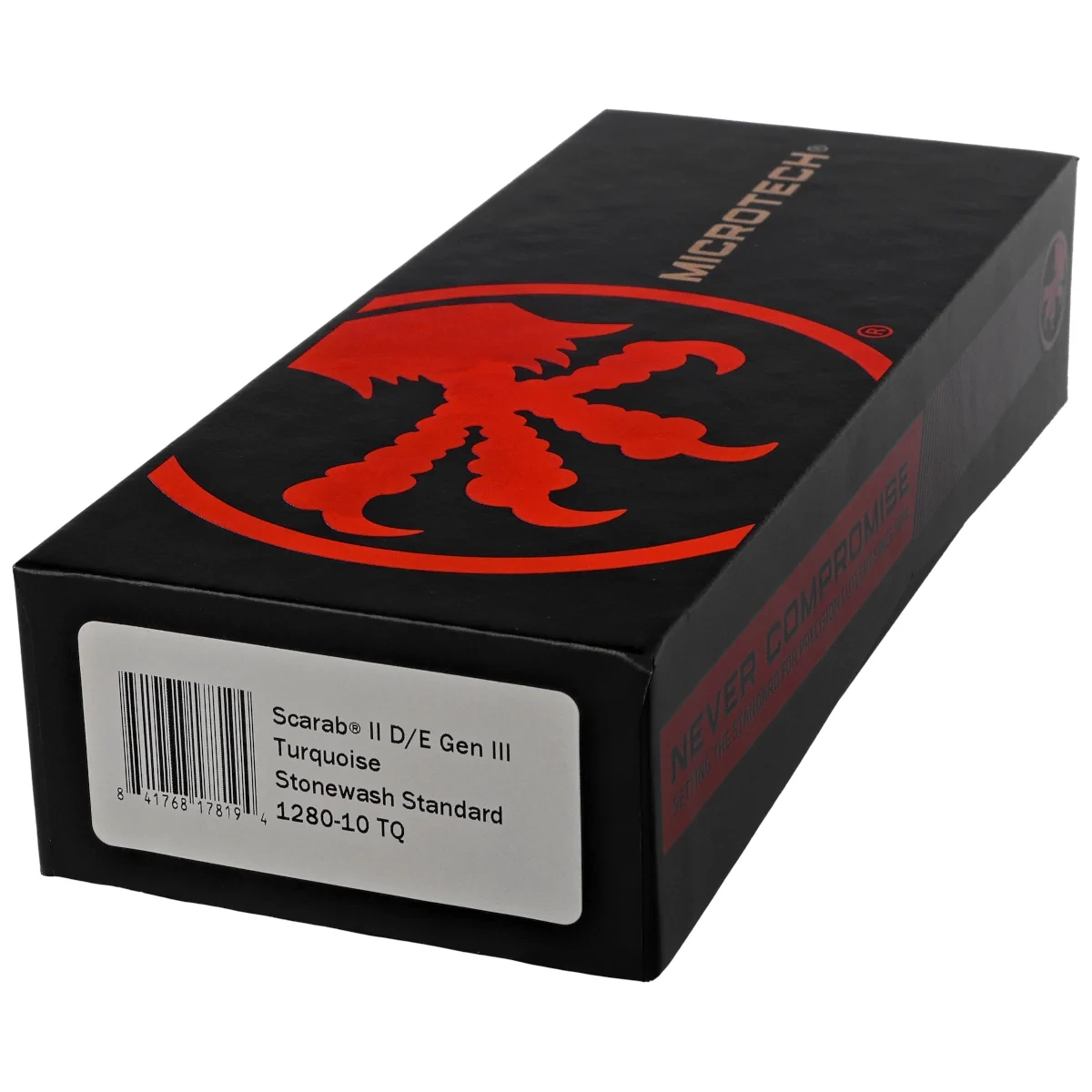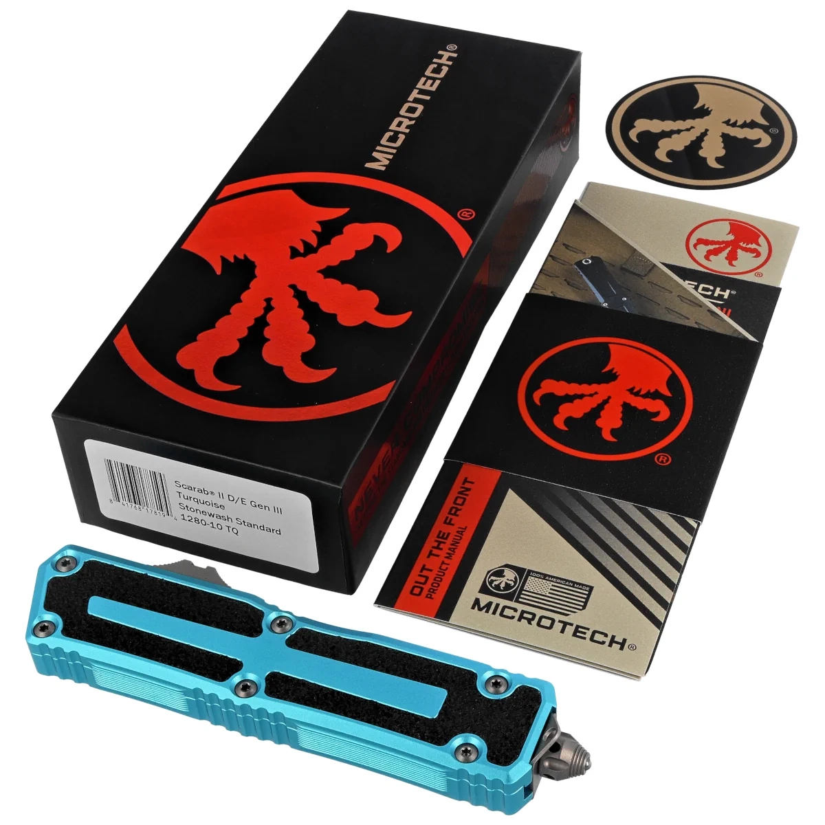 Scarab II Gen III D/E Turquoise Aluminum/3M, Stonewashed is the pinnacle of excellence in automatic tactical knives, taking inspiration from the original Microtech Ultratech design. Built to withstand the toughest conditions, the new Scarab II is the ultimate choice for heavy use. While retaining the styling features of its predecessor, it sets a new standard for OTF (Out The Front) technology.
