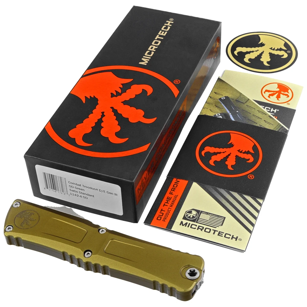 Combat Troodon Gen III D/E OD Green Aluminum, Satin the largest of the automatic knives, is the pinnacle of precision engineering and tactical efficiency in the field of OTF (Out The Front) knives. Built for a wide range of uses, it is 25% larger than the flagship Troodon. Precision-crafted, equipped with a sophisticated and extremely fast retractable mechanism and a razor-sharp blade. 100% made and assembled in the USA. Designed by Anthony Marfione, knifemaker and owner of Microtech Knives.