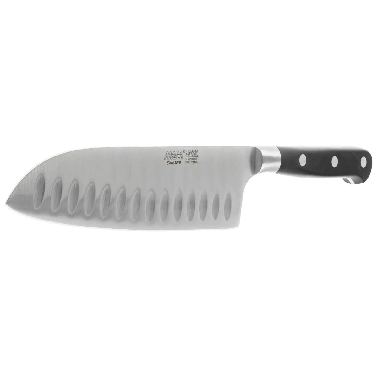 Santoku Granton Edge Black Polymer, Polished is a modern tool inspired by Japanese kitchen philosophy, adapted to the needs of today's users. Manufactured by MAM – Filmam, Lda., it combines traditional forging with functional details that make everyday kitchen work more precise and comfortable. The blade is made of polished X30Cr13 stainless steel, ensuring resistance to kitchen conditions and easy maintenance. The long Granton Edge grooves, characteristic of this model, reduce resistance when cutting and make it easier to cut thin slices without sticking to the blade. The handle is made of durable POM plastic, suitable for intensive use, and has been designed with ergonomics and stability in mind. The 66903 model is the perfect choice for those who expect professional performance and modern aesthetics in a single compact kitchen knife.