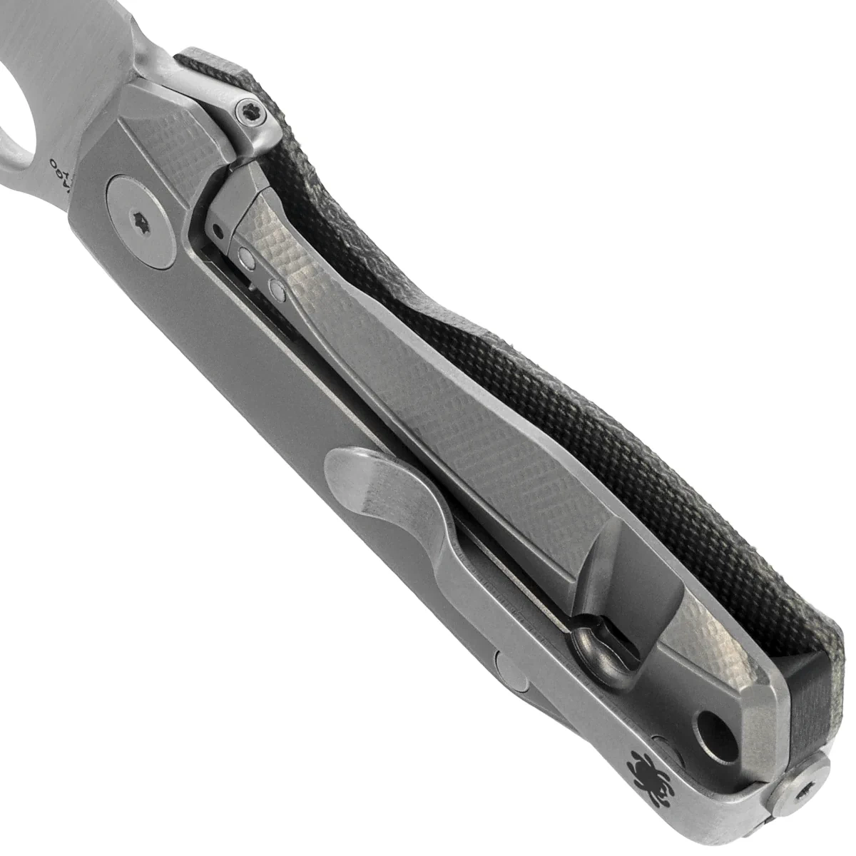 Handle - a harmonious combination of Canvas Micarta composite and titanium, which offers not only visual contrast, but also real utility value. The green Micarta grip brings lightness, texture and a natural look, while the titanium side - integrated with the R.I.L. lock - is responsible for rigidity and mechanical safety. Handle design supports comfortable handling of the knife in everyday tasks, despite its small size. Gently rounded edges, ergonomic shape and open design facilitate both grip and cleaning. Thewire clip in the tip-up position, designed for right-handed users, provides a discreet and secure hold. This is a miniature tool with full-size precision, created for the most demanding collectors and EDC users.