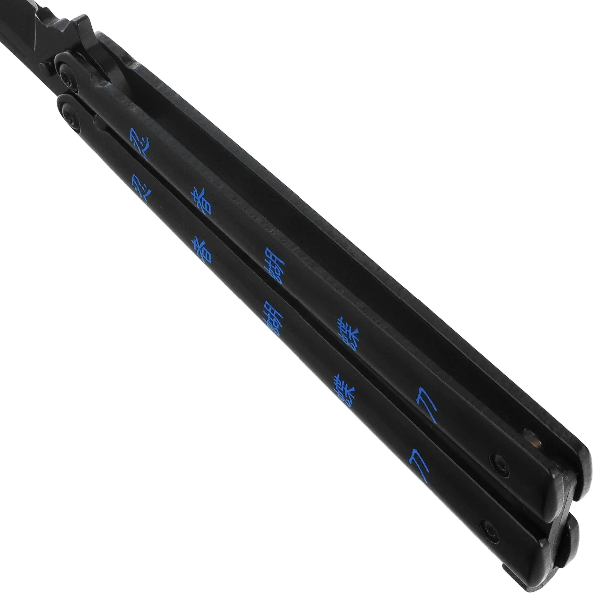 Handle - made of blackened stainless steel, offering adequate weight and rigidity, conducive to performing impressive tricks. The symmetrical design of the arms facilitates balance, which is important for manipulation training. Decorative milling and blue details refer to the design inspired by oriental culture. Rounded edges improve grip comfort, although the lack of texturing limits grip in wet conditions. A classic latch (latch) closes the shoulders, securing the knife while carrying it. This is an aesthetically pleasing balisong, which stands out both on display and in the hand.