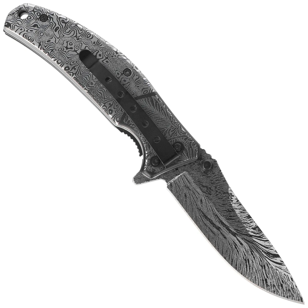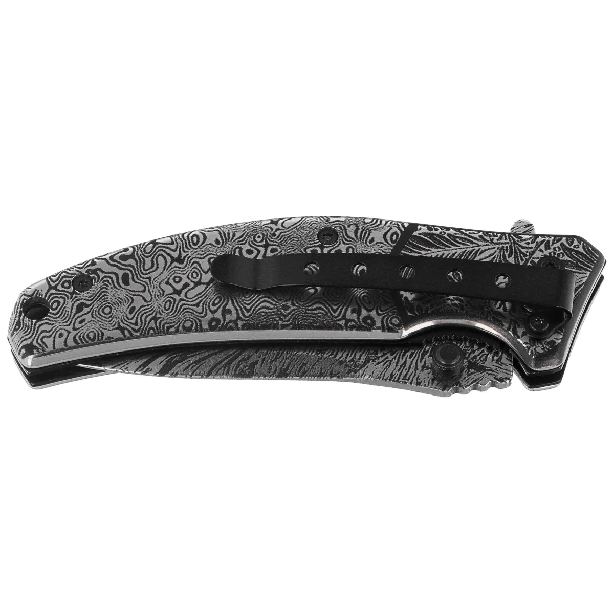Handle - made of steel grips, decorated with the same 3D pattern as on the blade. This design ensures high resistance to mechanical damage and moisture, and its symmetrical, minimalist appearance perfectly matches the blade. Despite the smooth surface, the proper balance and length of the handle ensure good grip control. A carrying clip mounted on one side allows for easy and discreet carrying of the knife in your pocket. The handle of this model is an option for those who appreciate monolithic, solid construction with distinctive details – durable, practical and aesthetic in everyday use.